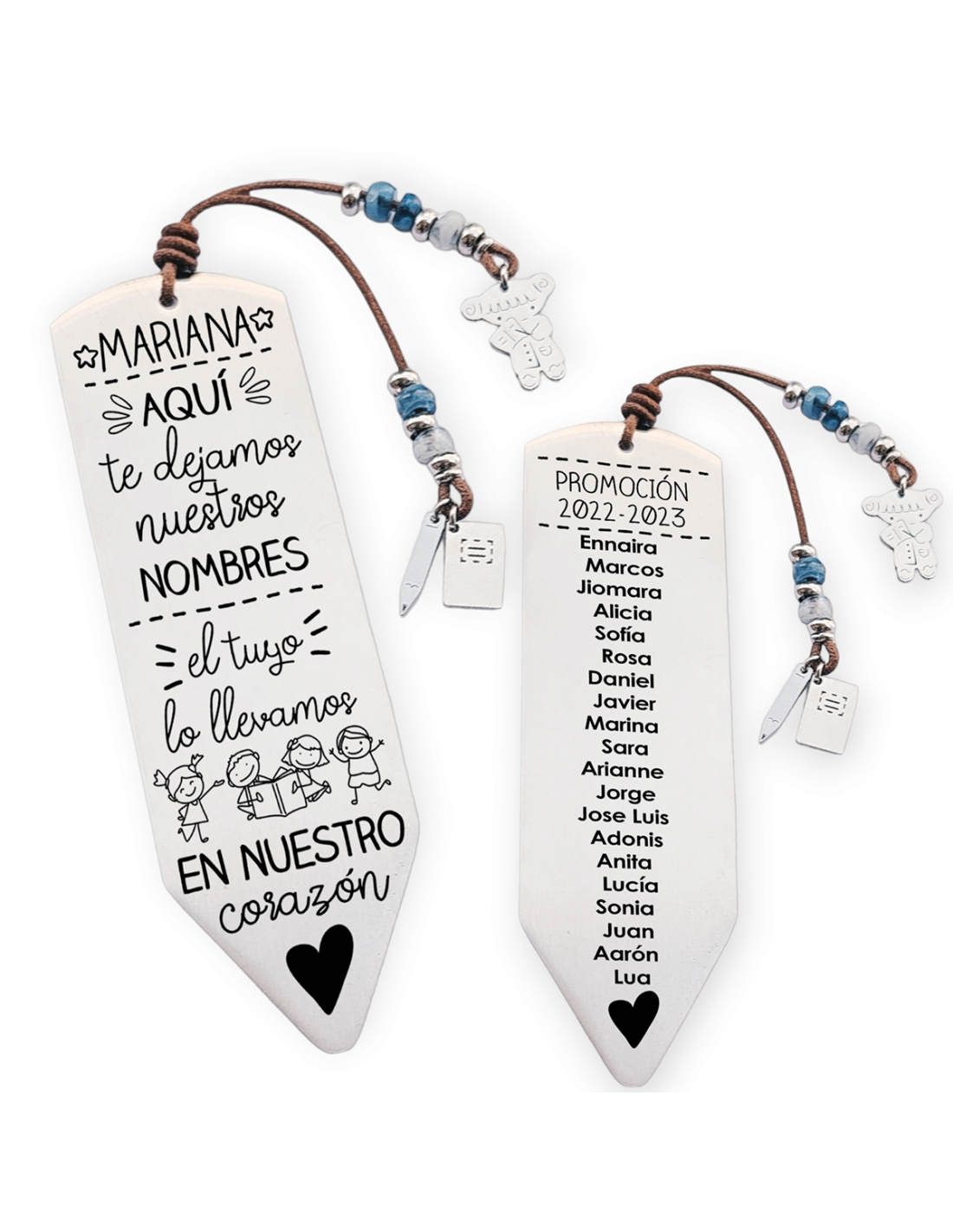 Personaliza el marcapáginas por delante con el nombre del profesor. Puedes añadir todos los nombres de los niños por detrás, junto la promoción, como en el ejemplo.