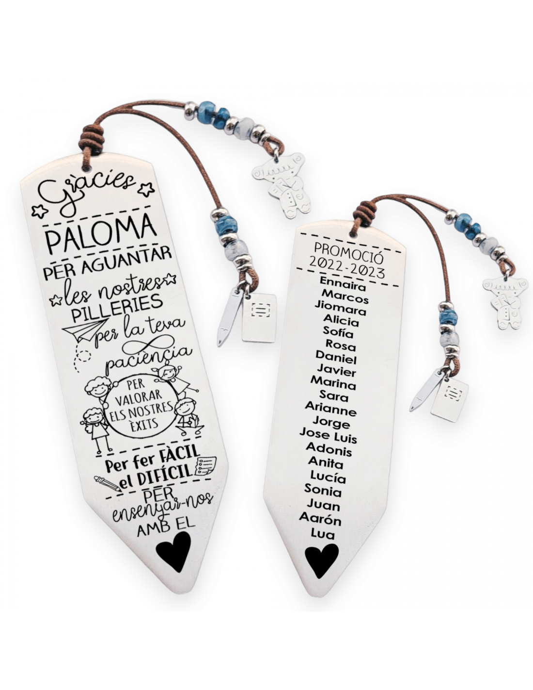 Personaliza el marcapáginas por delante con el nombre del profesor. Puedes añadir todos los nombres de los niños por detrás, junto la promoción, como en el ejemplo.