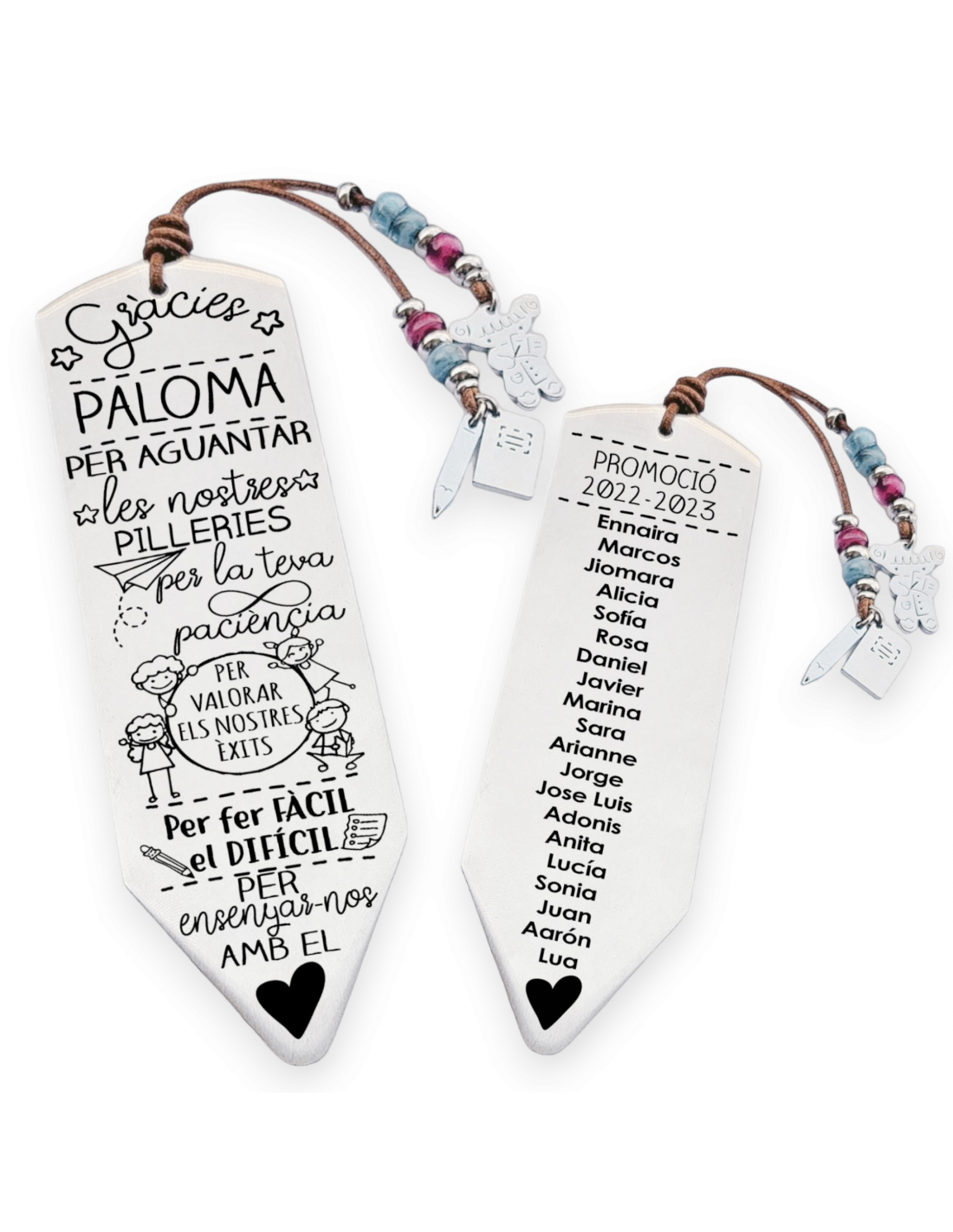 Personaliza el marcapáginas por delante con el nombre del profesor. Puedes añadir todos los nombres de los niños por detrás, junto la promoción, como en el ejemplo.