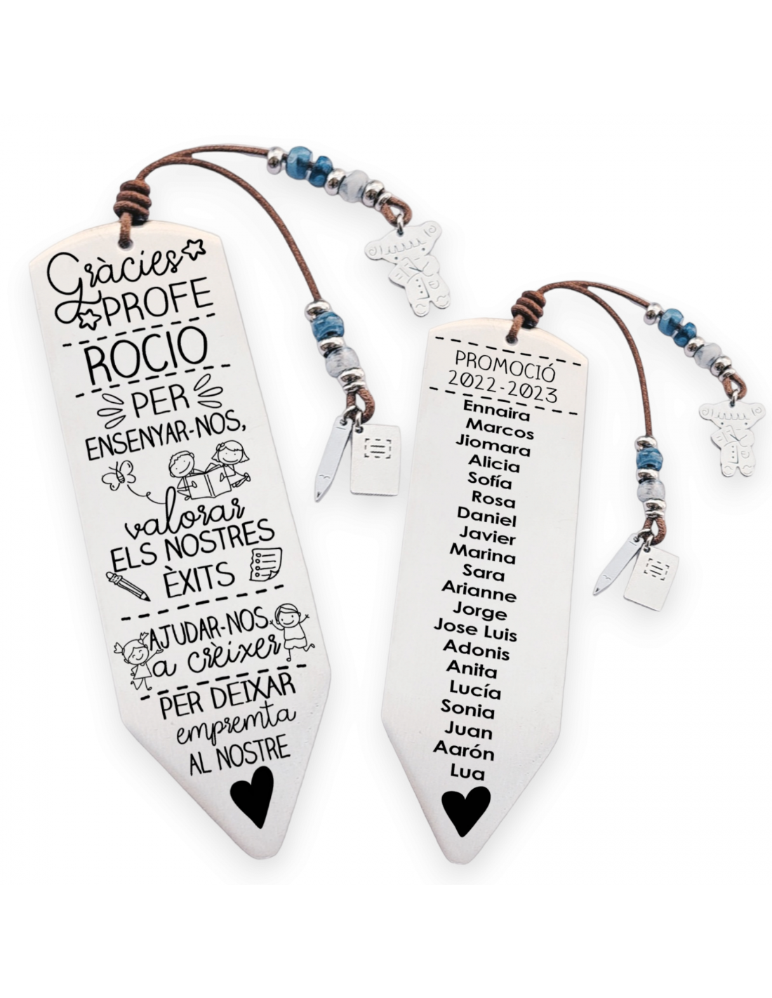 Personaliza el marcapáginas por delante con el nombre del profesor. Puedes añadir todos los nombres de los niños por detrás, junto la promoción, como en el ejemplo.
