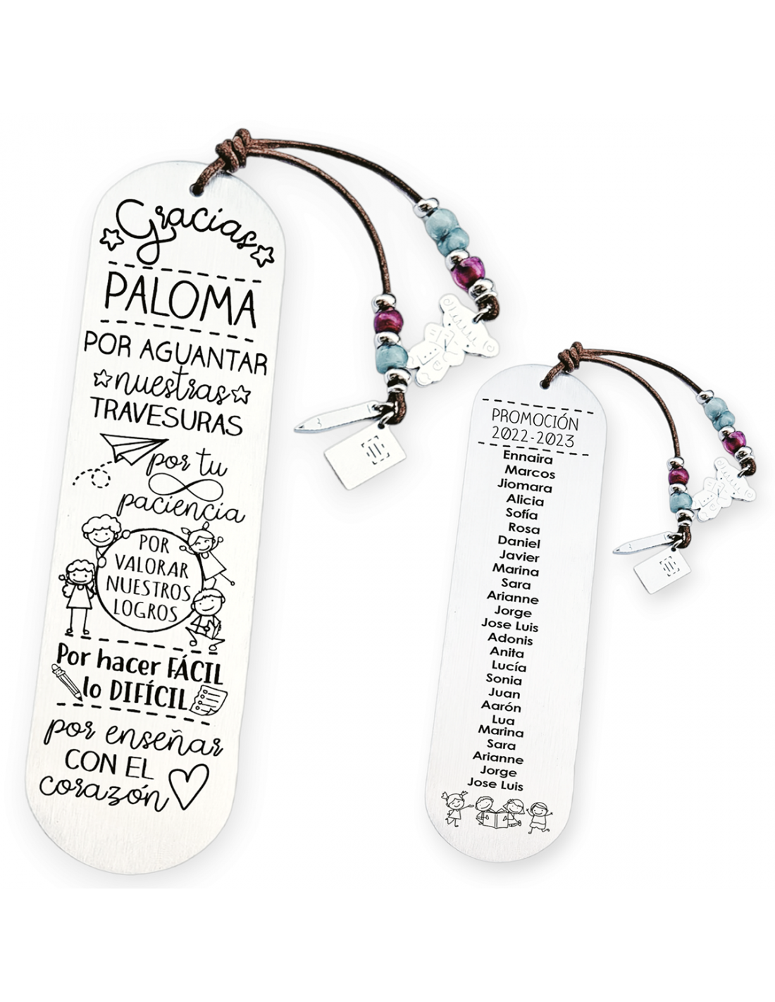 Personaliza el marcapáginas por delante con el nombre del profesor. Puedes añadir todos los nombres de los niños por detrás, junto la promoción, como en el ejemplo.