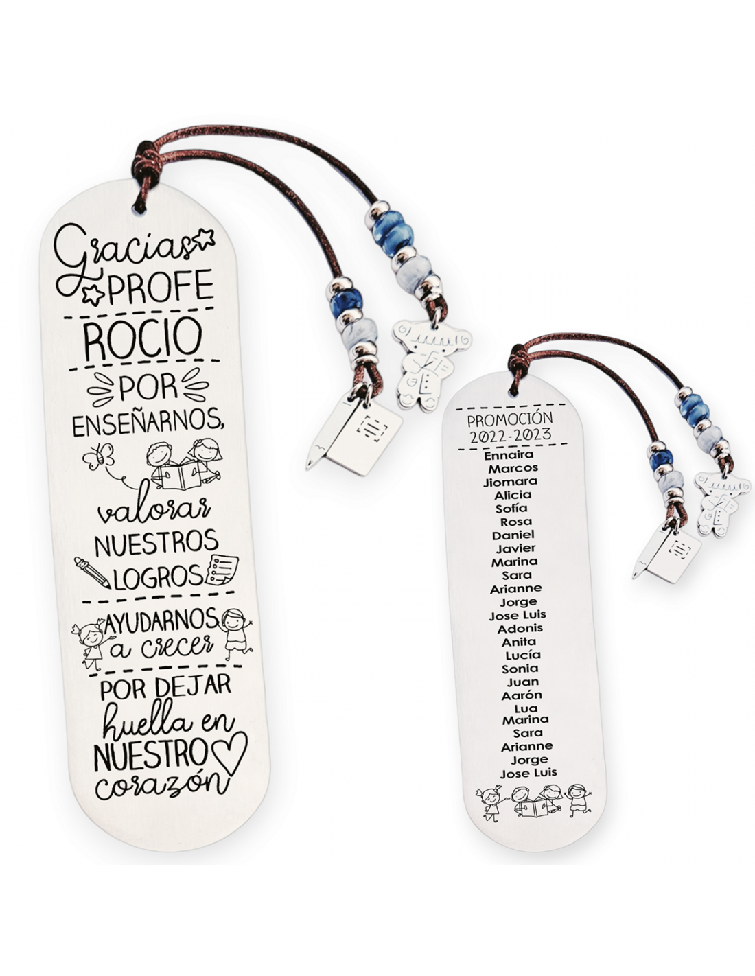 Personaliza el marcapáginas por delante con el nombre del profesor. Puedes añadir todos los nombres de los niños por detrás, junto la promoción, como en el ejemplo.