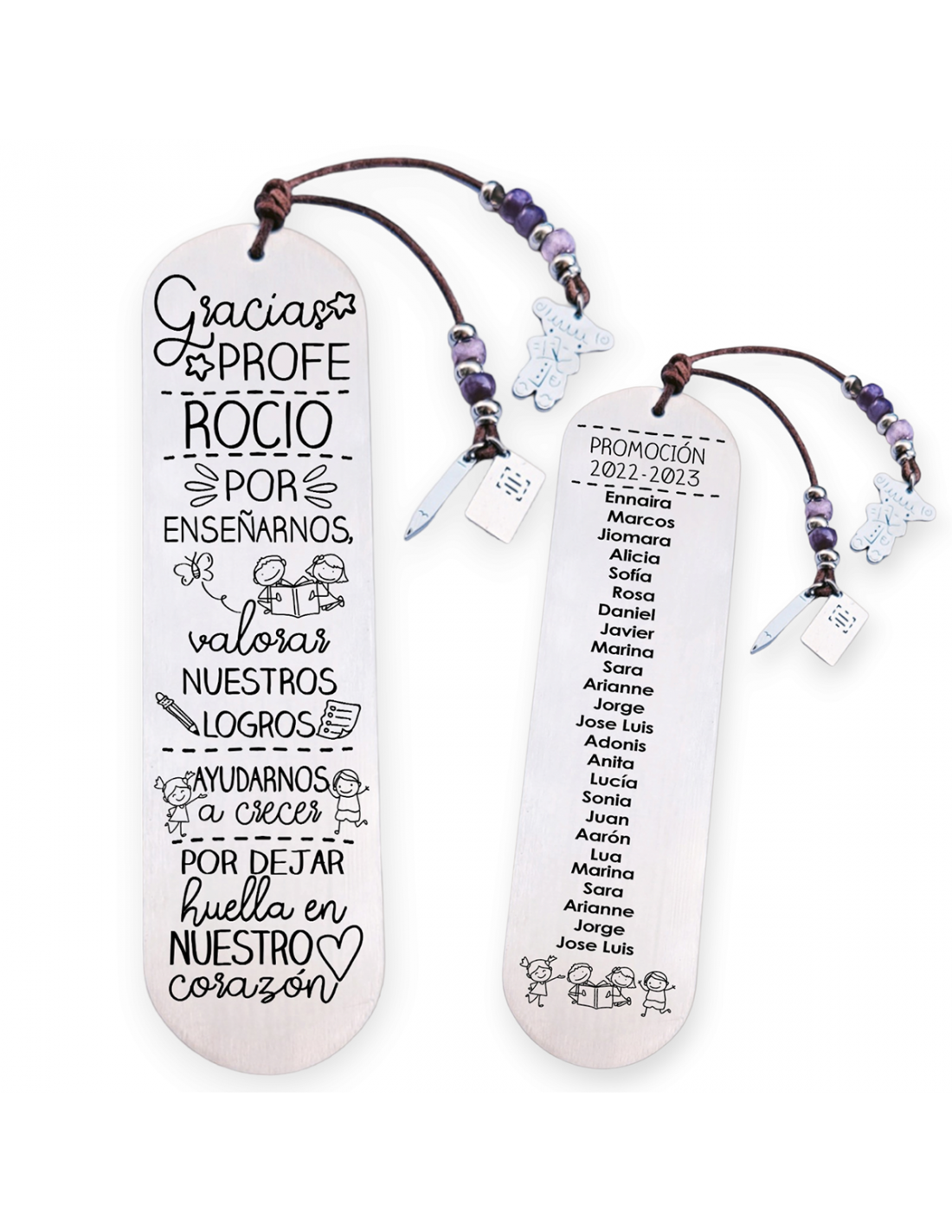 Personaliza el marcapáginas por delante con el nombre del profesor. Puedes añadir todos los nombres de los niños por detrás, junto la promoción, como en el ejemplo.