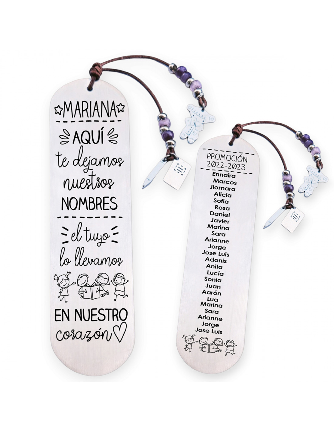 Personaliza el marcapáginas por delante con el nombre del profesor. Puedes añadir todos los nombres de los niños por detrás, junto la promoción, como en el ejemplo.