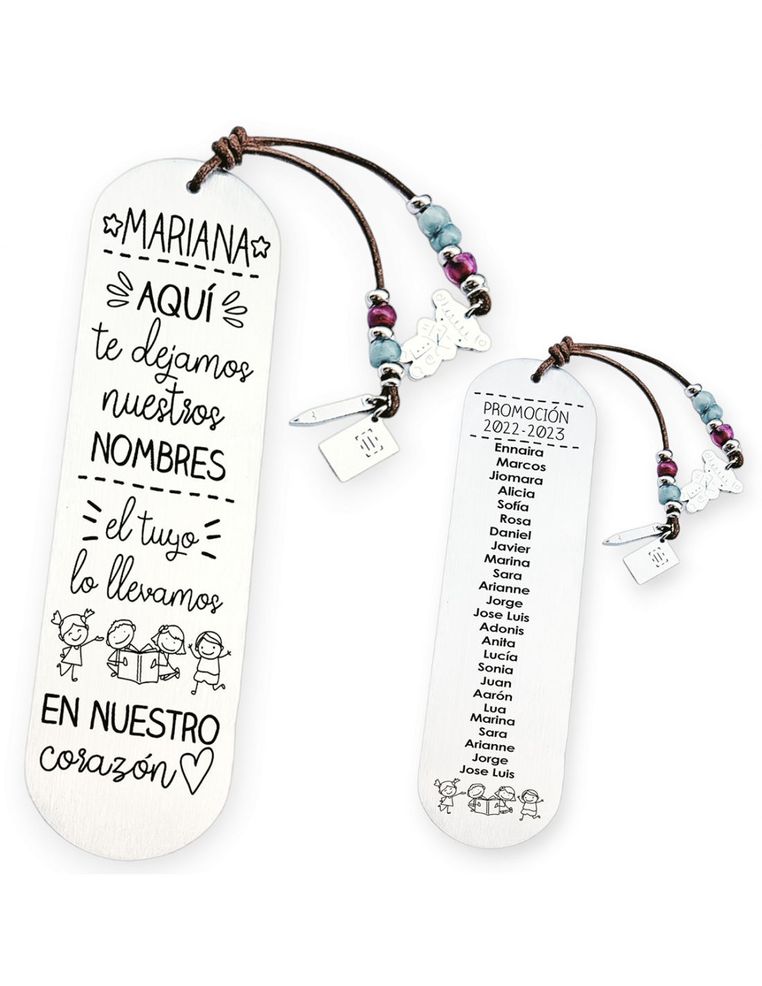 Personaliza el marcapáginas por delante con el nombre del profesor. Puedes añadir todos los nombres de los niños por detrás, junto la promoción, como en el ejemplo.