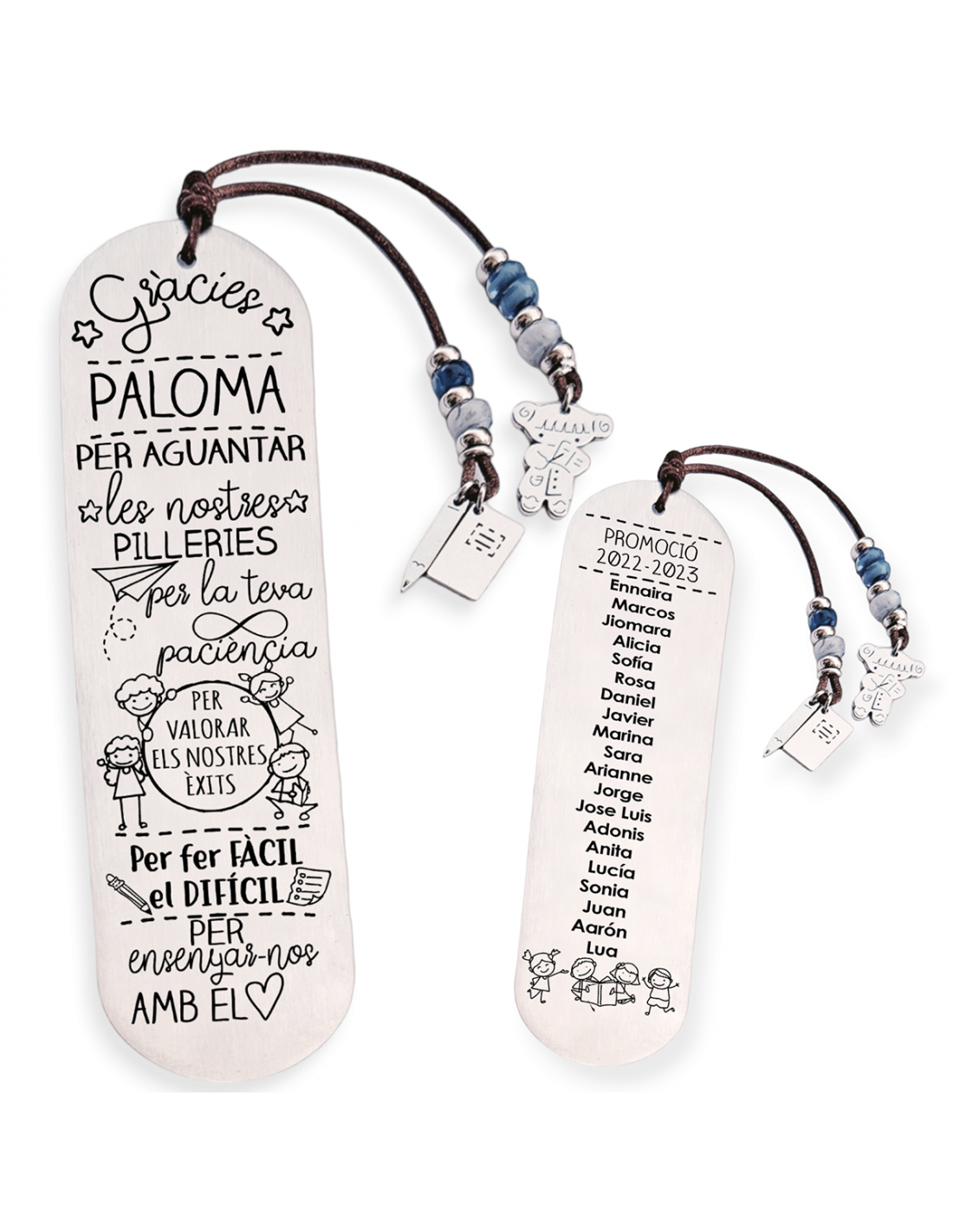 Personaliza el marcapáginas por delante con el nombre del profesor. Puedes añadir todos los nombres de los niños por detrás, junto la promoción, como en el ejemplo.