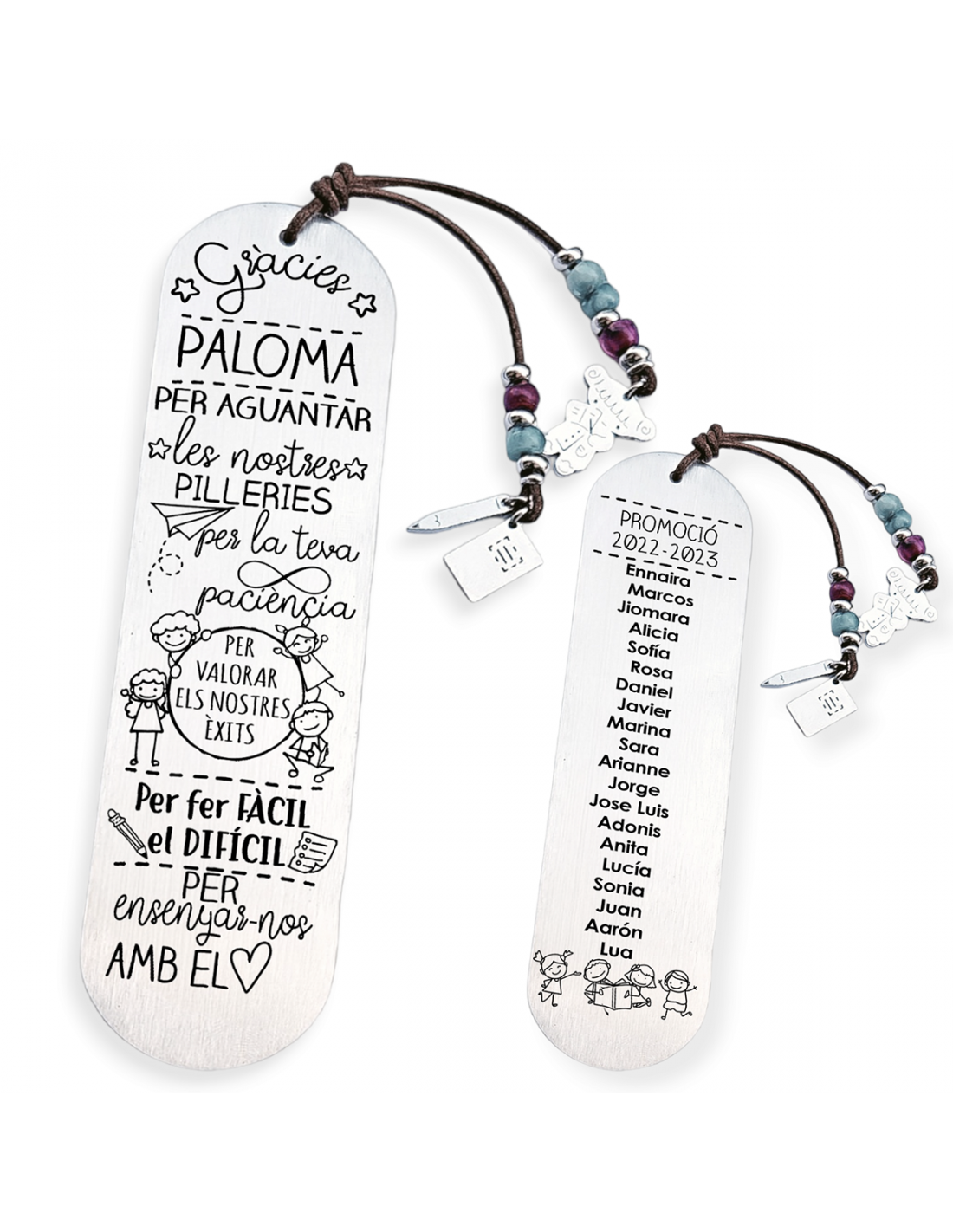 Personaliza el marcapáginas por delante con el nombre del profesor. Puedes añadir todos los nombres de los niños por detrás, junto la promoción, como en el ejemplo.