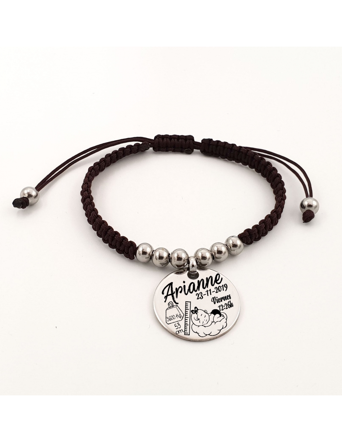 Pulsera Natalicia niña, modelo ESPIGA, disponible en marrón y negro, ajustable, rellena los campos.