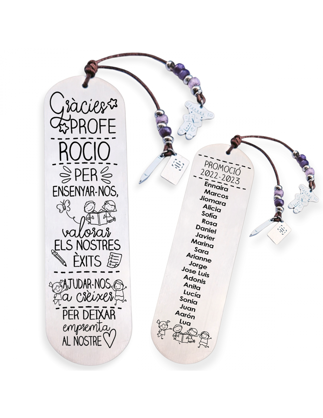 Personaliza el marcapáginas por delante con el nombre del profesor. Puedes añadir todos los nombres de los niños por detrás, junto la promoción, como en el ejemplo.