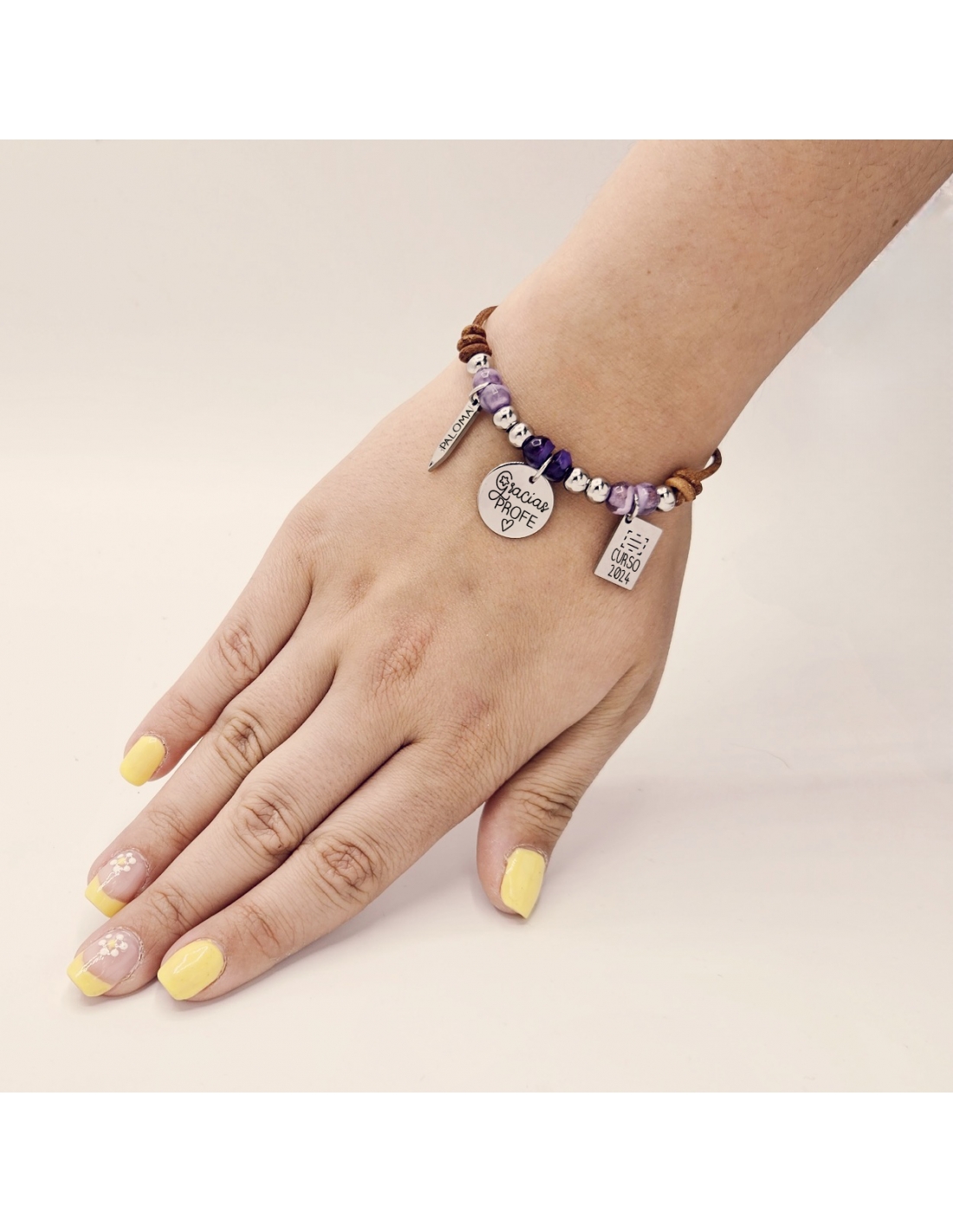 Puedes personalizar la pulsera con el nombre del profesor en el lápiz y el curso en la libreta.
