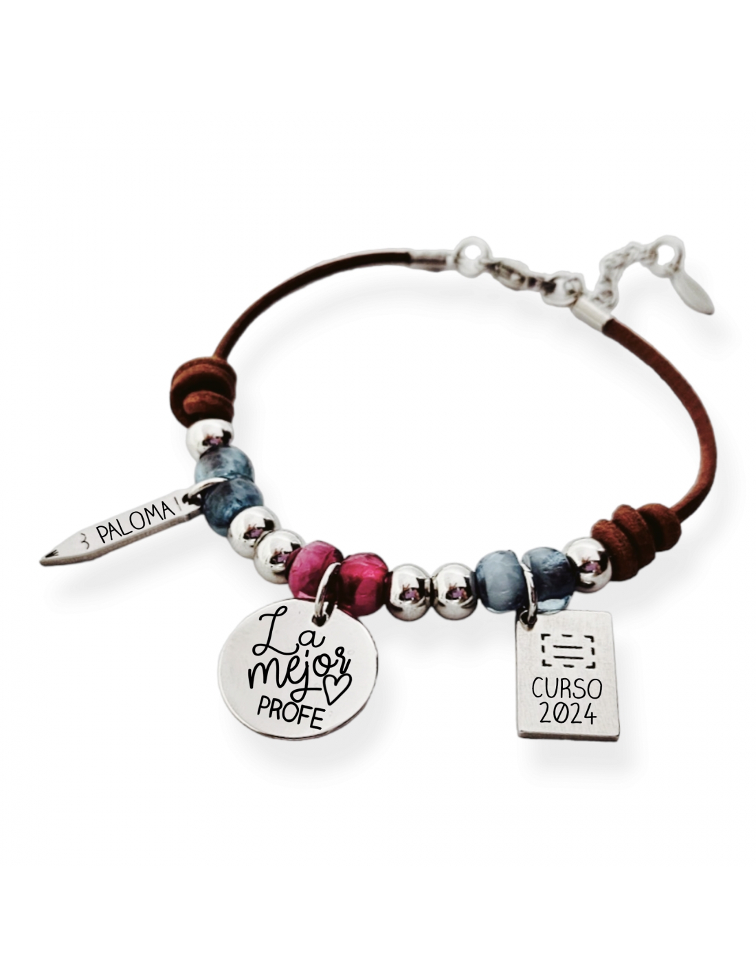 Pulsera LA MEJOR PROFE, ajustable de cuero nacional, acero inoxidable con detalle a color en resinas de alta calidad y brillo.