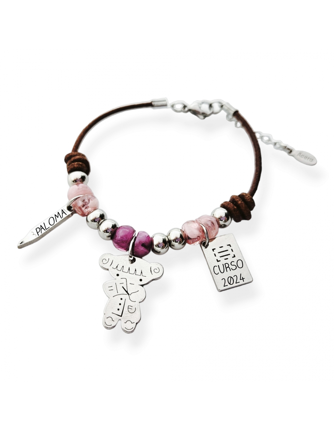 Puedes personalizar la pulsera con el nombre del profesor en el lápiz y el curso en la libreta.