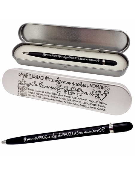 4- ESTUCHE PARA EL BOLÍGRAFO: Un estuche resistente y elegante con dedicatoria al profesor, los nombres de los niños y el curso. Inscripción: (nombre del profesor) Aquí te dejamos nuestros nombres, el tuyo lo llevamos en el corazón.