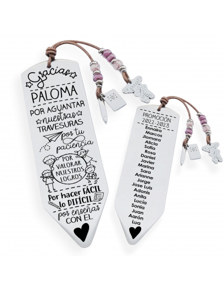 5- MARCAPÁGINAS: Un marcapáginas duradero con dedicatoria al profesor, los nombres de los niños y el curso.