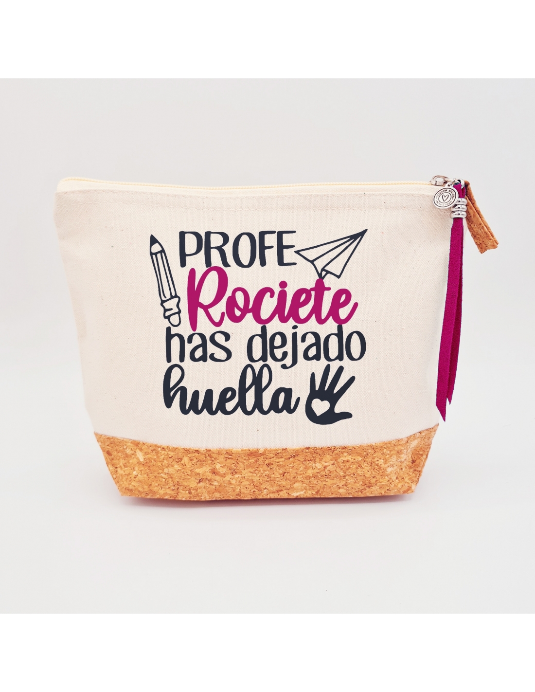 1- NECESER PERSONALIZADO: Un práctico neceser con el mensaje "Profe (nombre del profesor), has dejado huella". Ideal para almacenar productos de cuidado personal o cualquier otro objeto pequeño.