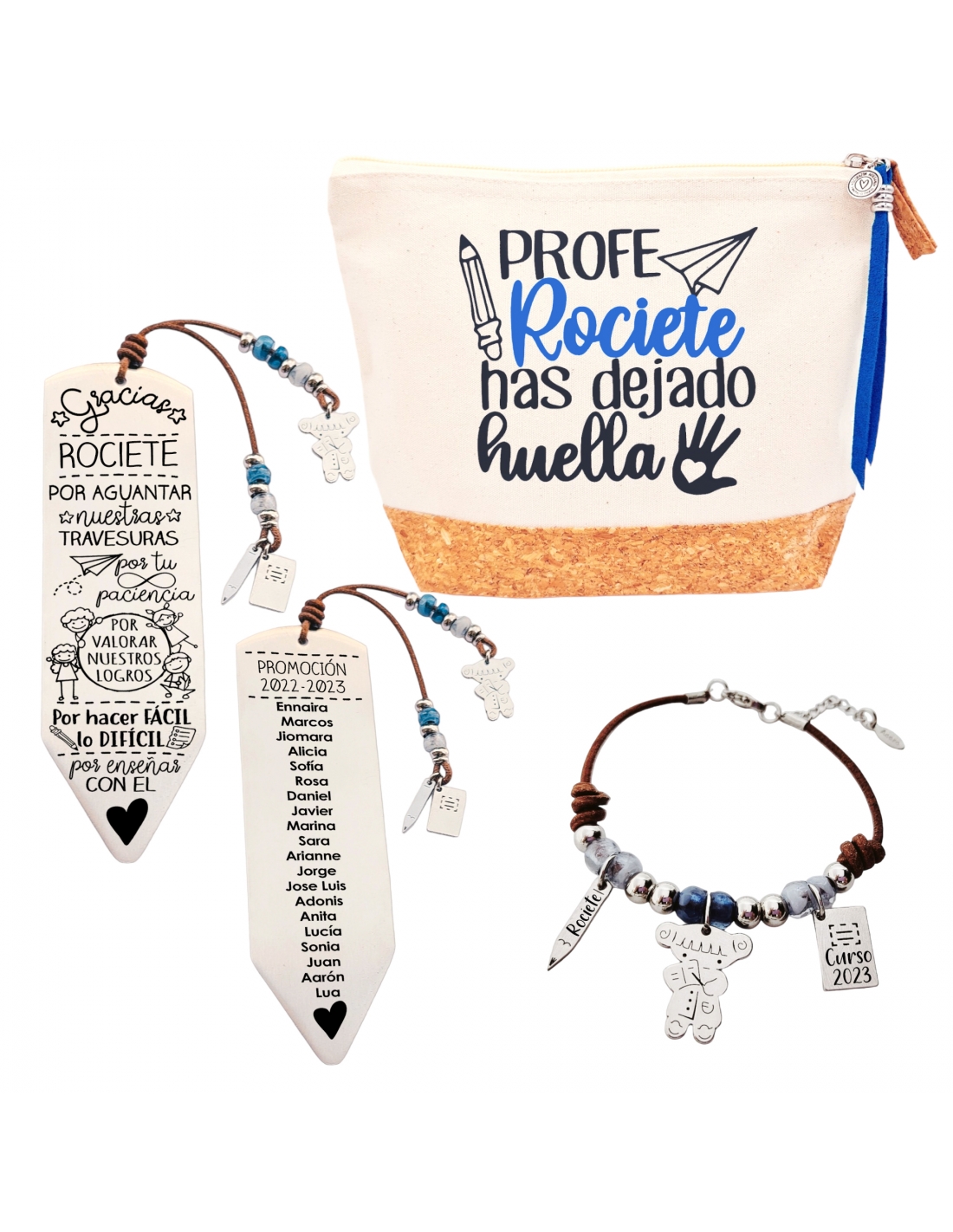 1-NECESER: Un elegante neceser con la frase "Gracias (nombre del profe), has dejado huella". Es perfecto para almacenar productos de cuidado personal o cualquier otro objeto pequeño.