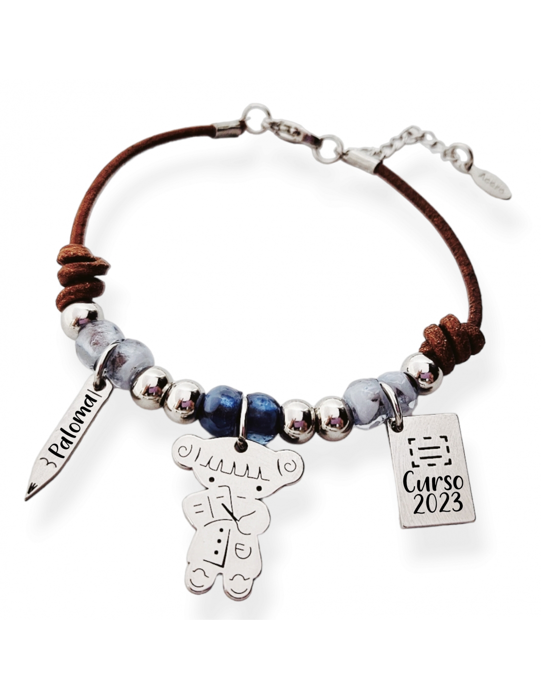 3-PULSERA: Una hermosa pulsera de cuero con abalorios que representan elementos relacionados con la profesión de profesora, como un cuaderno y un lápiz. Además, se puede personalizar con el curso y el nombre de la profesora, haciendo que sea un regalo único y especial.