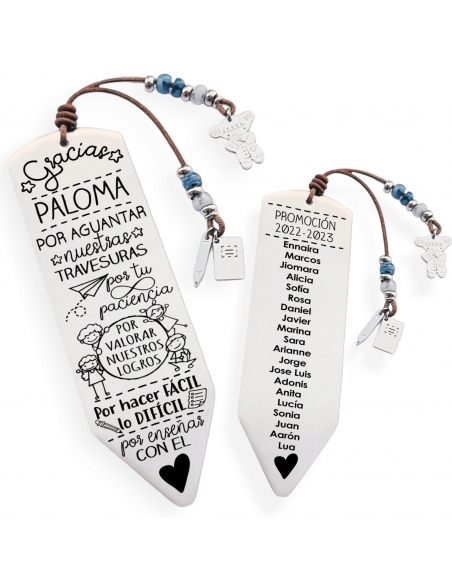 2-MARCAPÁGINAS: Un marcapáginas único con el nombre del profesor, los nombres de los alumnos y la promoción. Será un recordatorio especial de su tiempo juntos.