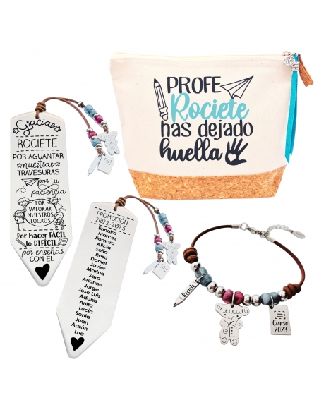 1-NECESER: Un elegante neceser con la frase "Gracias (nombre del profe), has dejado huella". Es perfecto para almacenar productos de cuidado personal o cualquier otro objeto pequeño.