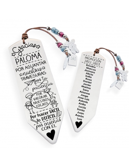 2-MARCAPÁGINAS: Un marcapáginas único con el nombre del profesor, los nombres de los alumnos y la promoción. Será un recordatorio especial de su tiempo juntos.