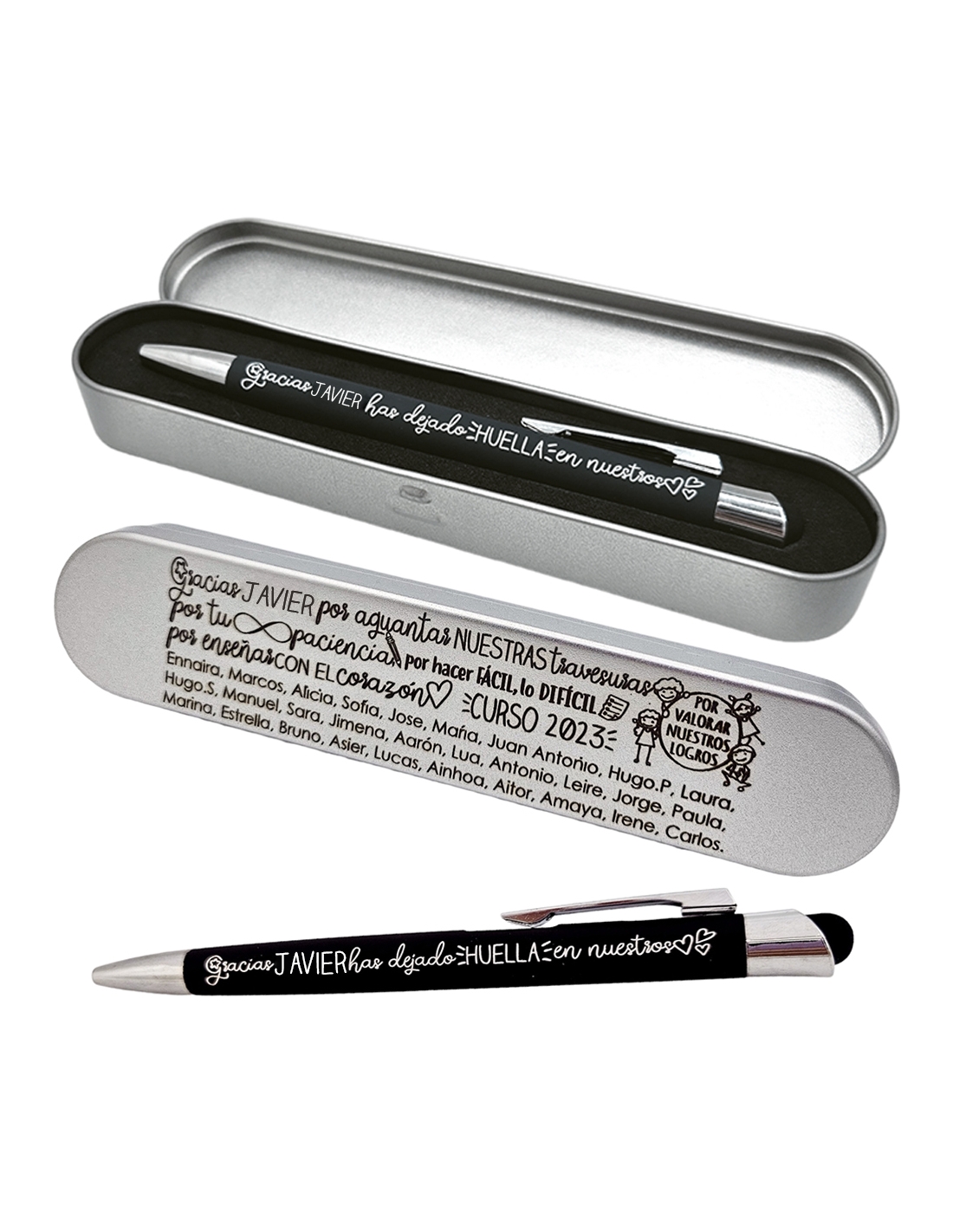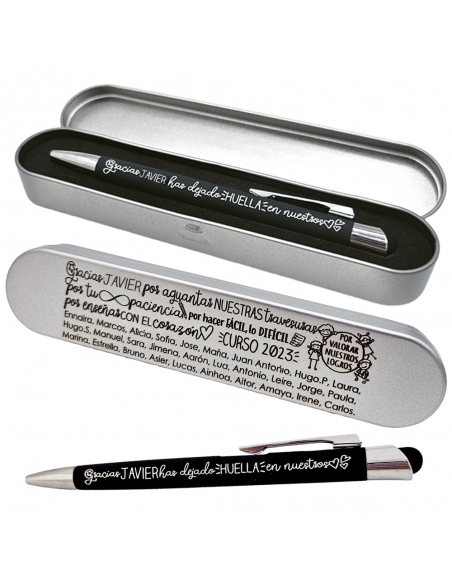 4- ESTUCHE:  Un estuche resistente y elegante donde el profesor podrá guardar el bolígrafo personalizado. El estuche lleva una dedicatoria que dice: "Gracias (nombre del profesor) por aguantar nuestras travesuras, tu infinita paciencia, valorar nuestros logros, hacer fácil lo difícil, por enseñar con el corazón". Además, incluye los nombres de los niños y el curso.