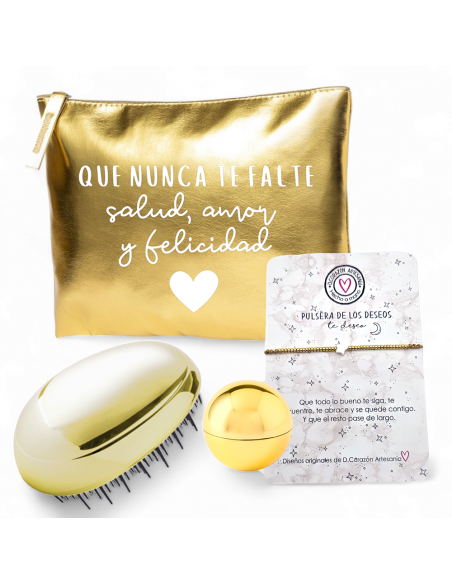 Súper kit para regalar, neceser con frase (que nunca te falte, saludo, amor y felicidad), peine, bálsamo y pulsera ajustable.