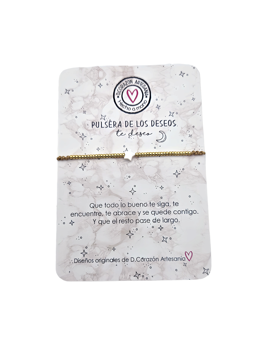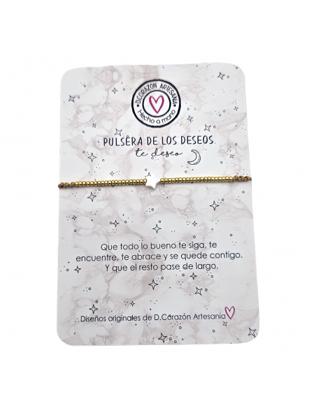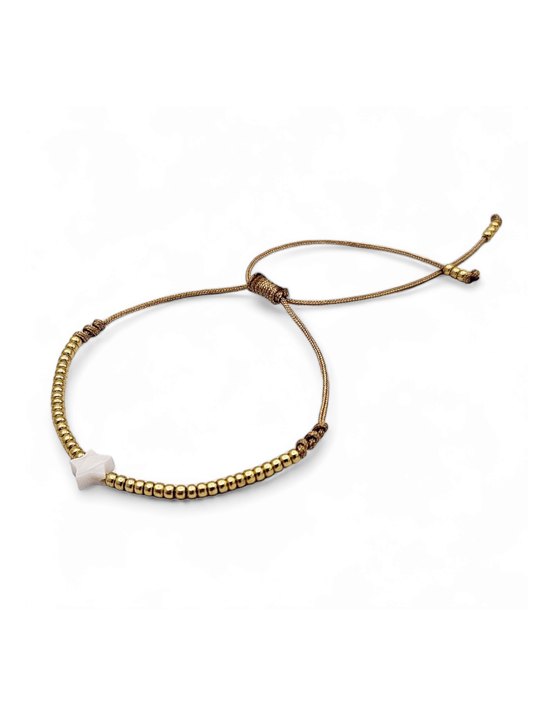 Preciosa pulsera ajustable con estrella de nácar. Incluye una tarjeta con el mensaje (Que todo lo bueno te siga, te encuentre y se quede contigo, y el resto pase de largo).