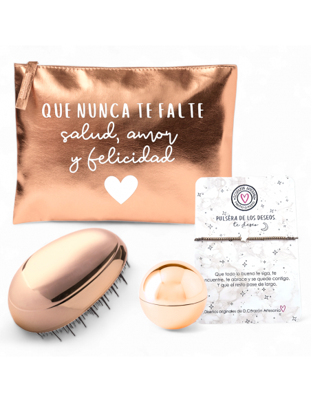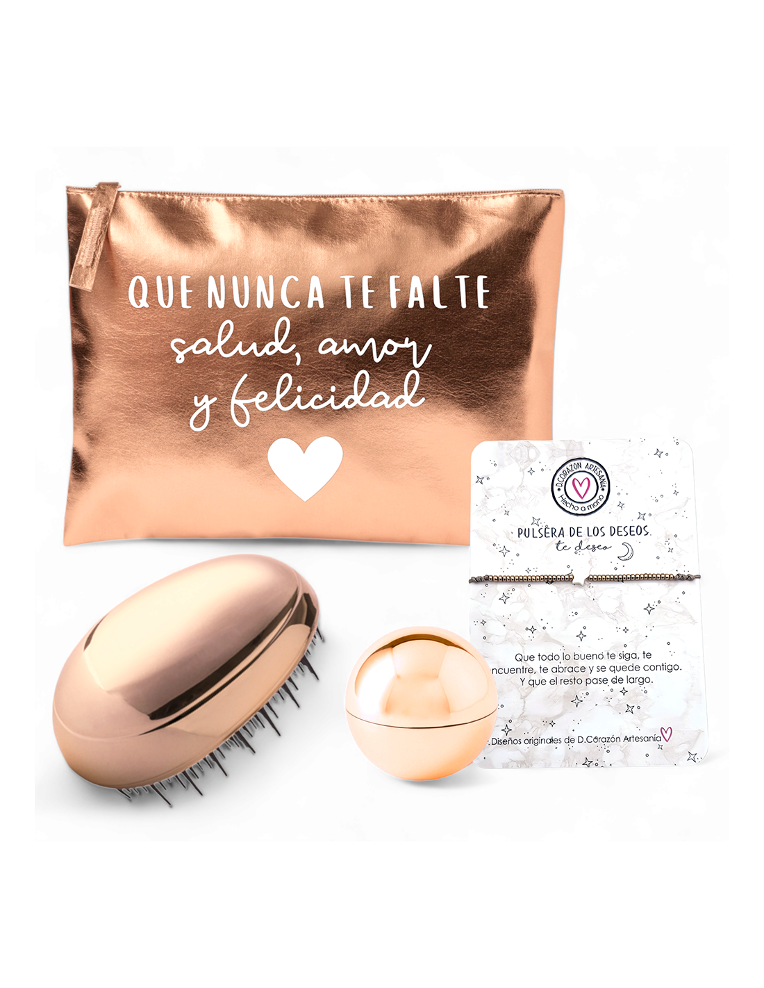 Súper kit para regalar, neceser con frase (que nunca te falte, saludo, amor y felicidad), peine, bálsamo y pulsera ajustable.