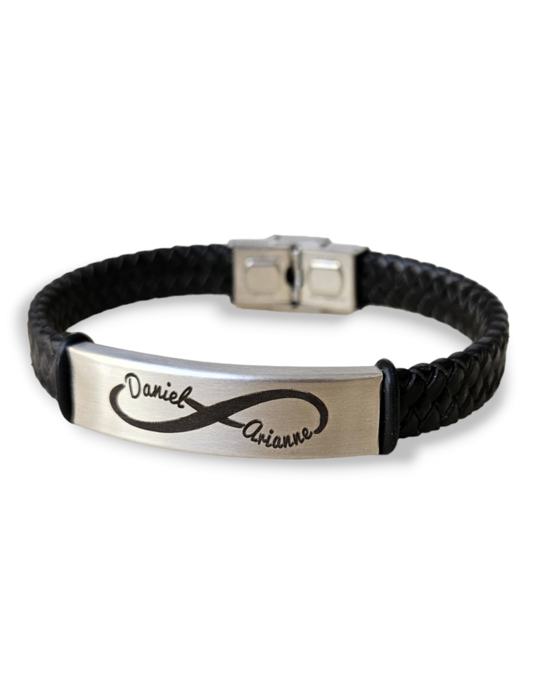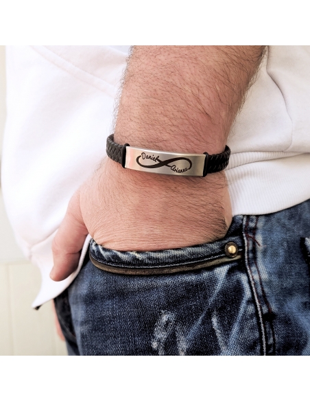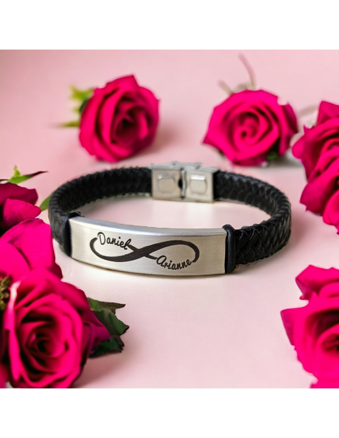 Pulsera de cuero personalizada con los nombres insertados en un infinito. Regalos de San Valentín.