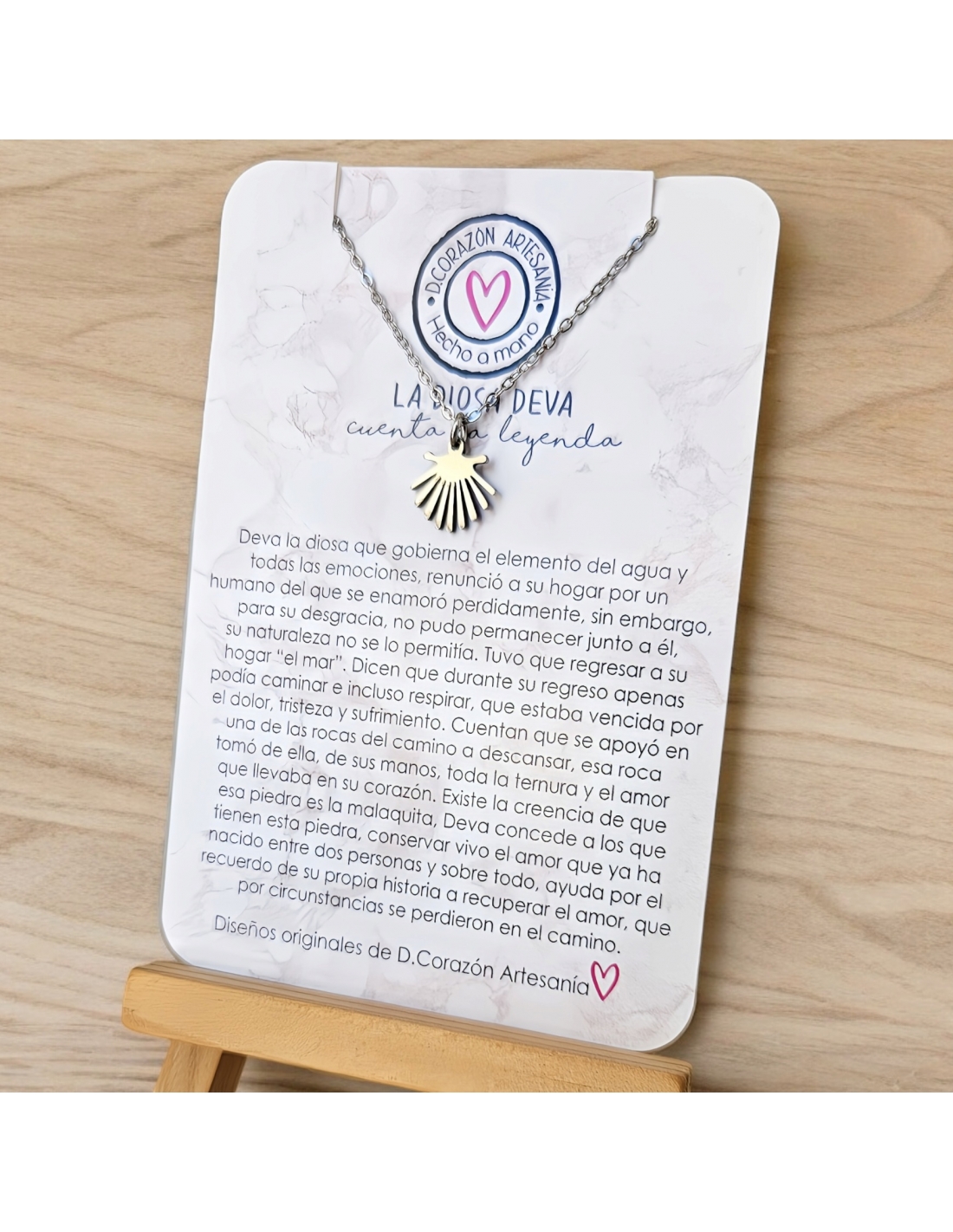 Deva la diosa que gobierna el elemento del agua y todas las emociones, renunció a su hogar por un humano del que se enamoró perdidamente, sin embargo, para su desgracia, no pudo permanecer junto a él, su naturaleza no se lo permitía. Tuvo que regresar a su hogar “el mar”. Dicen que durante su regreso apenas podía caminar e incluso respirar, que estaba vencida por el dolor, tristeza y sufrimiento. Cuentan que se apoyó en una de las rocas del camino a descansar, esa roca tomó de ella, de sus manos, toda la ternura y el amor que llevaba en su corazón. Existe la creencia de que esa piedra es la malaquita, Deva concede a los que tienen esta piedra, conservar vivo el amor que ya ha nacido entre dos personas y sobre todo, ayuda por el recuerdo de su propia historia a recuperar el amor, que por circunstancias se perdieron en el camino.