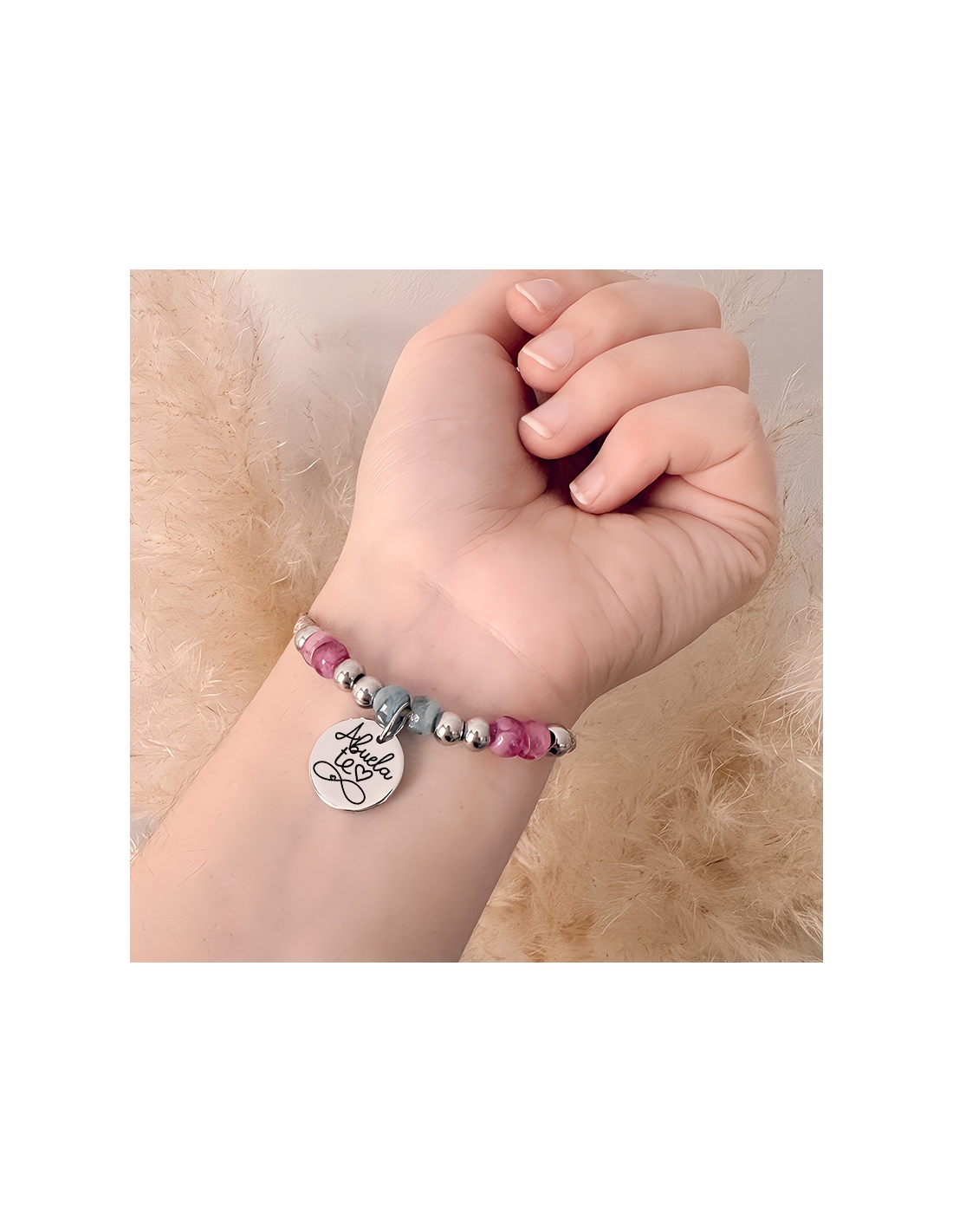 Pulsera modelo VIVA, con frase Mamá/Abuela te (corazón) hasta el (infinito) de acero inoxidable y resinas, ajustable.
