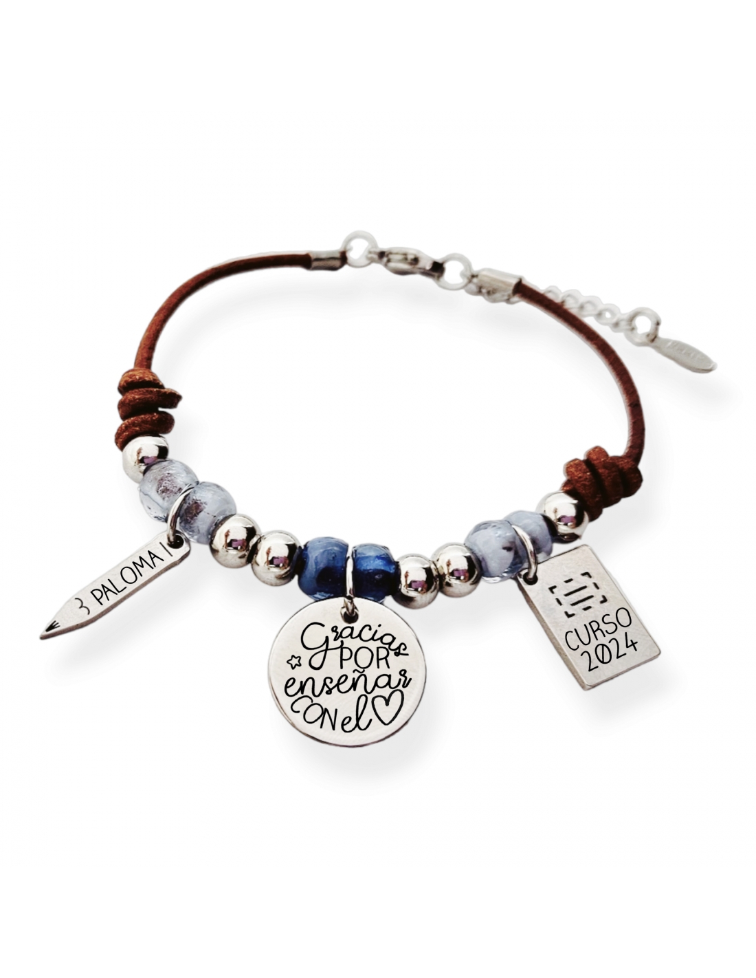 Puedes personalizar la pulsera con el nombre del profesor en el lápiz y el curso en la libreta.
