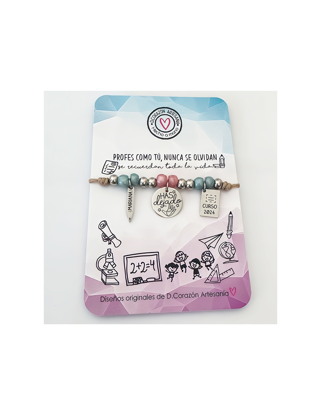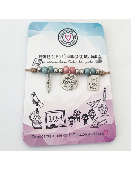 Puedes personalizar la pulsera con el nombre del profesor en el lápiz y el curso en la libreta.