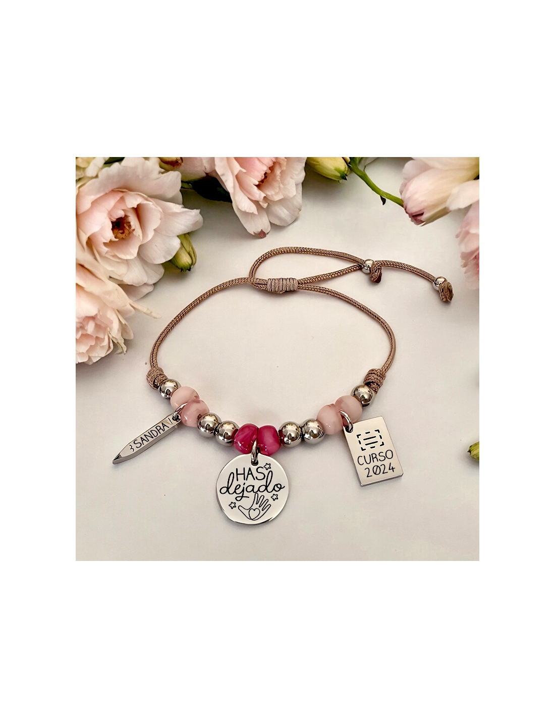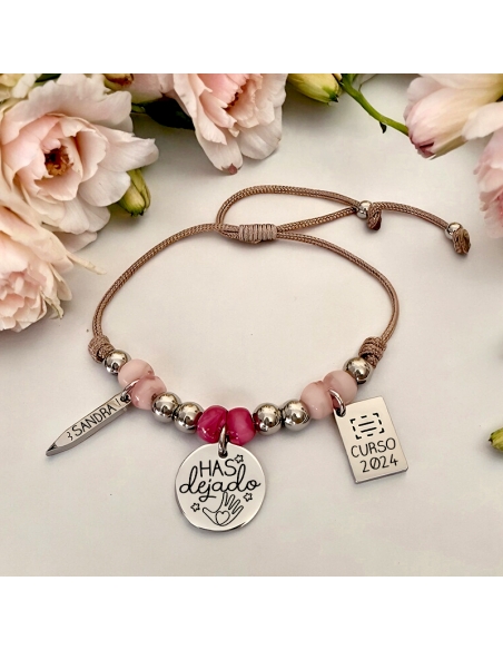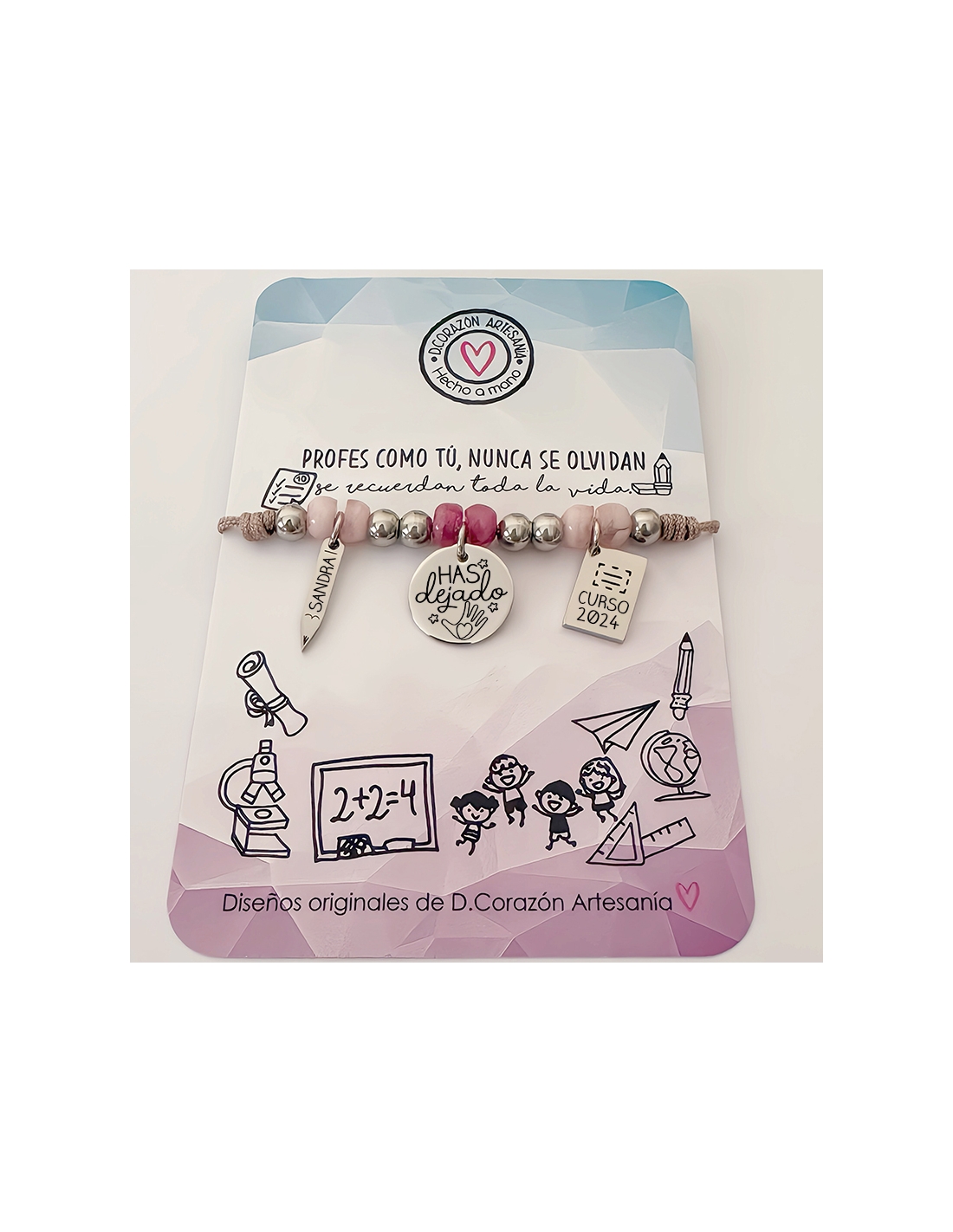 Puedes personalizar la pulsera con el nombre del profesor en el lápiz y el curso en la libreta.