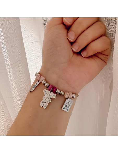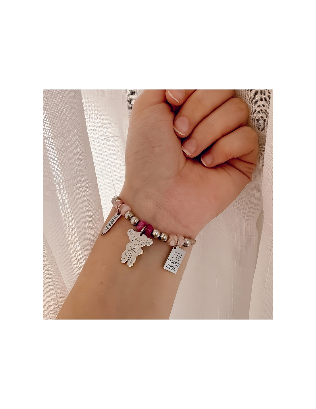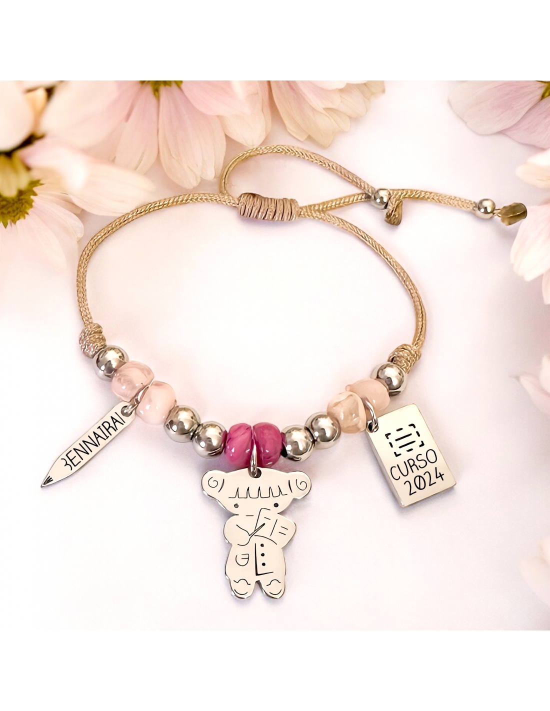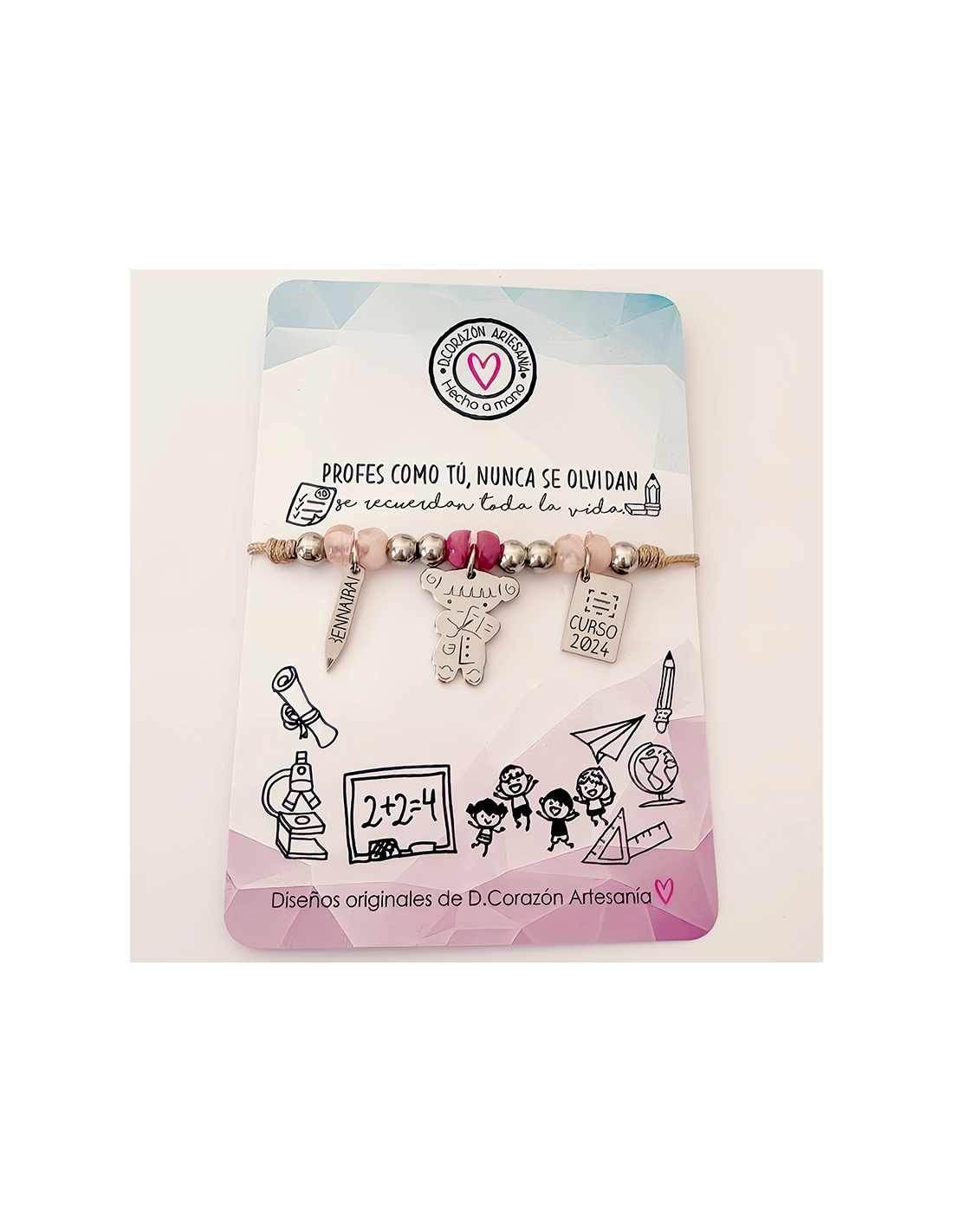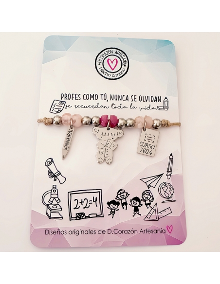 Puedes personalizar la pulsera con el nombre del profesor en el lápiz y el curso en la libreta.