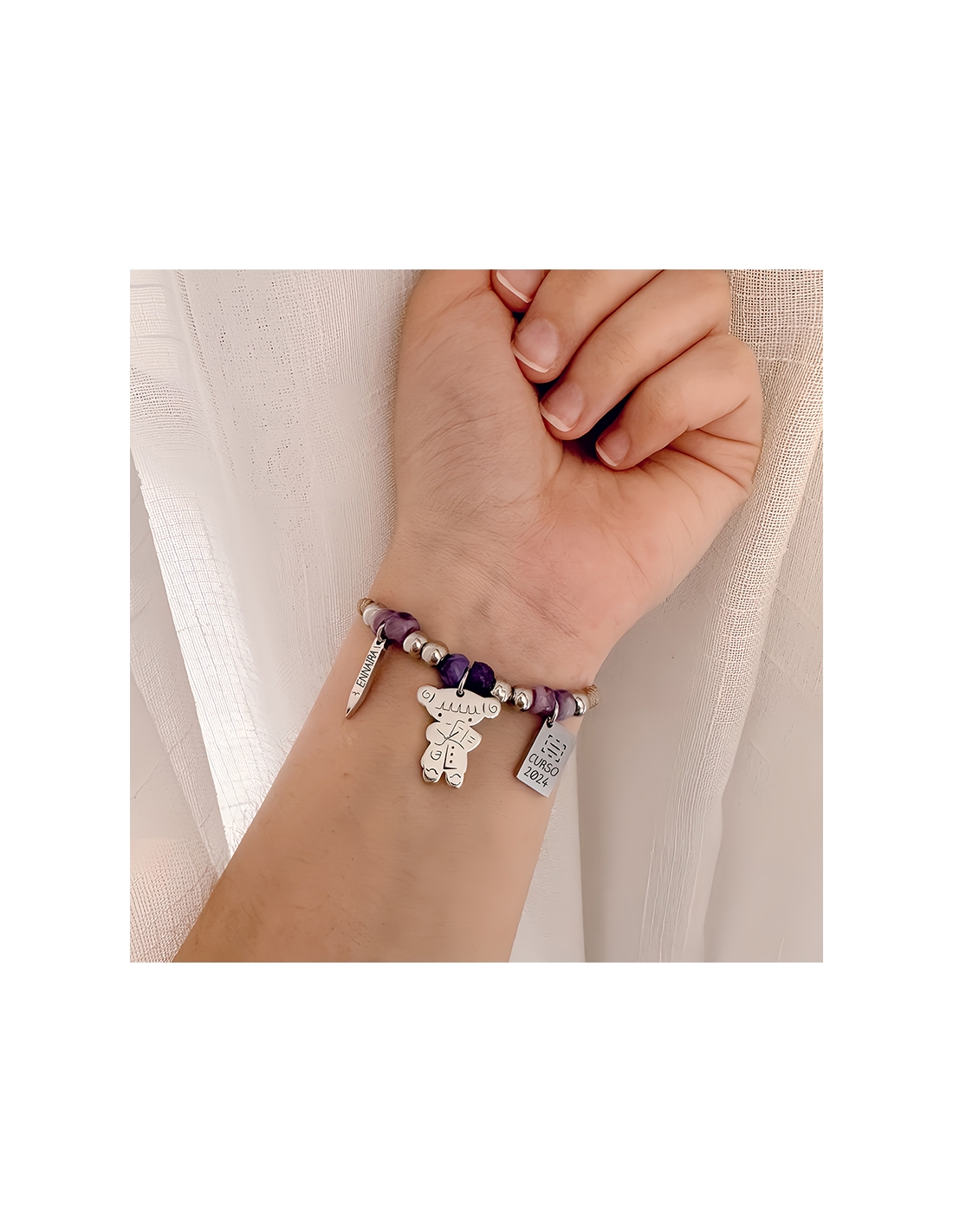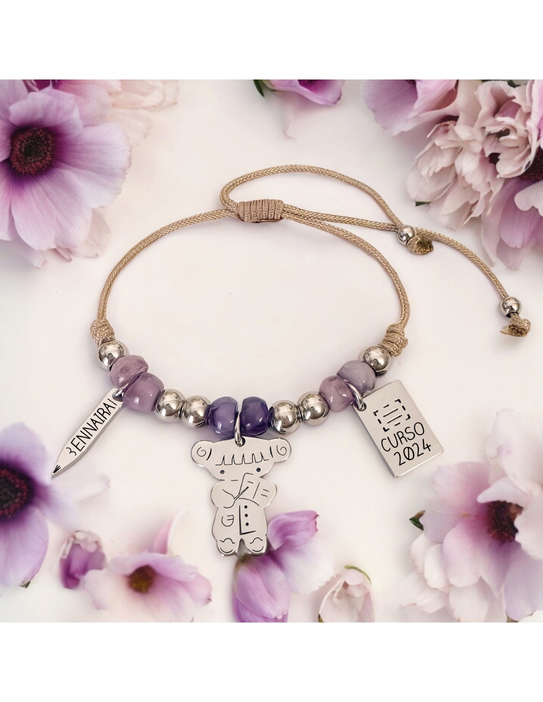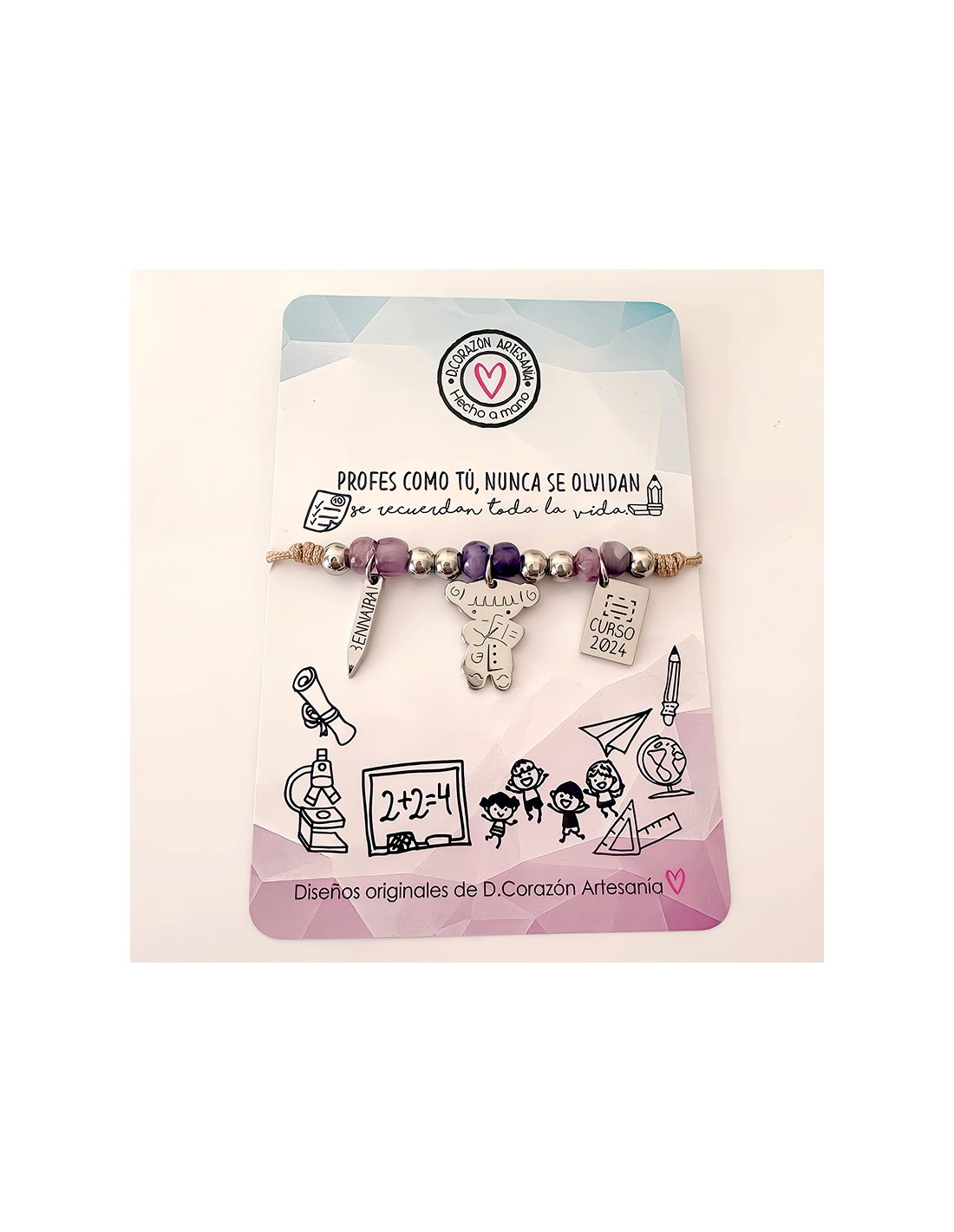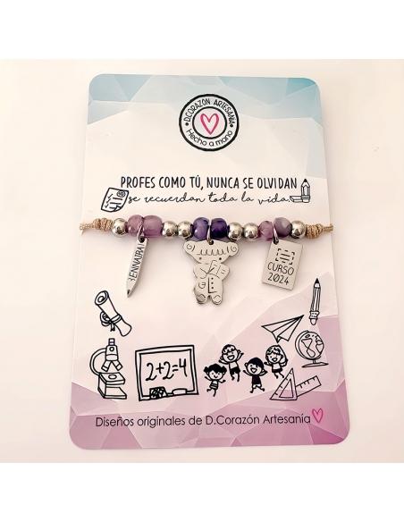 Puedes personalizar la pulsera con el nombre del profesor en el lápiz y el curso en la libreta.