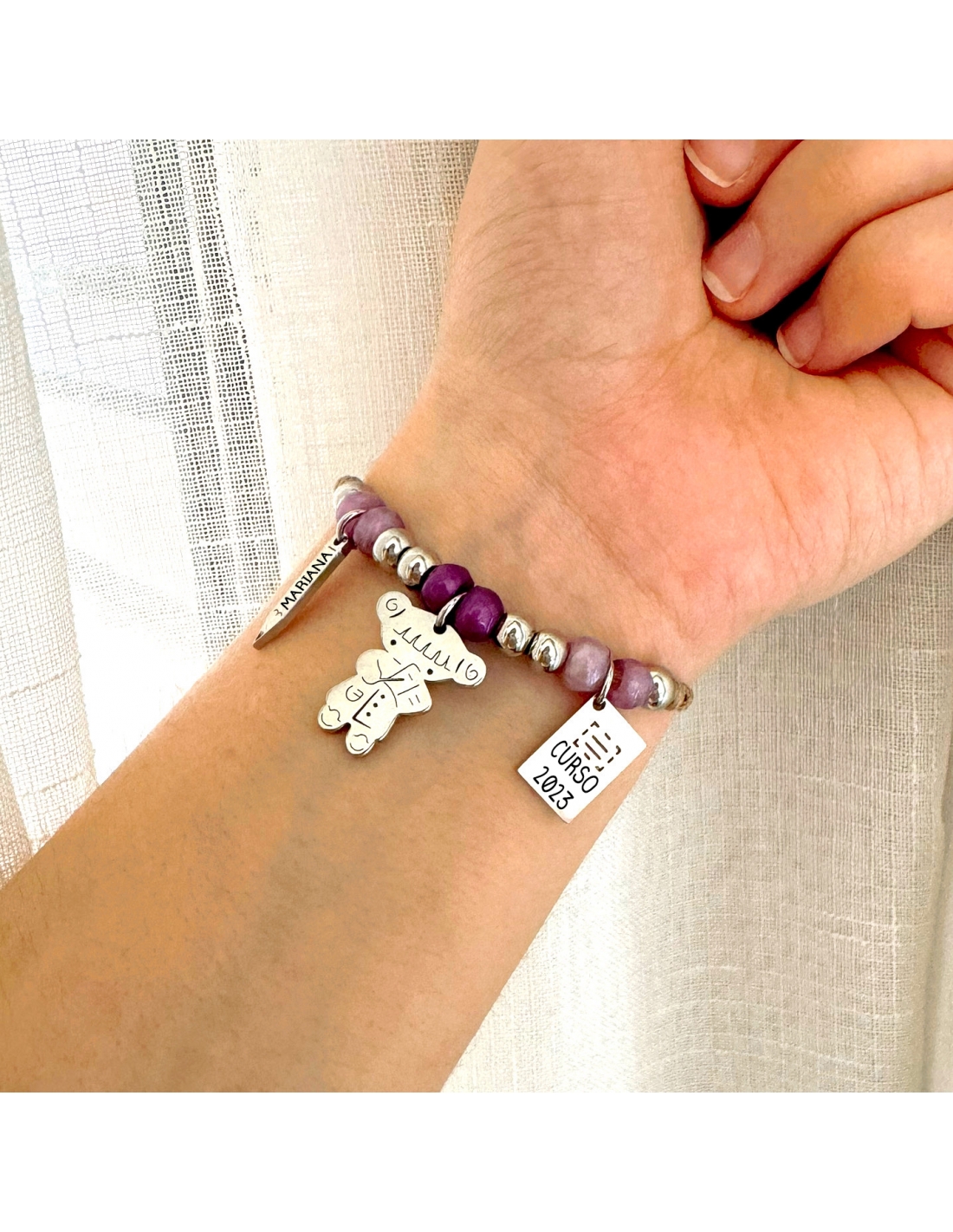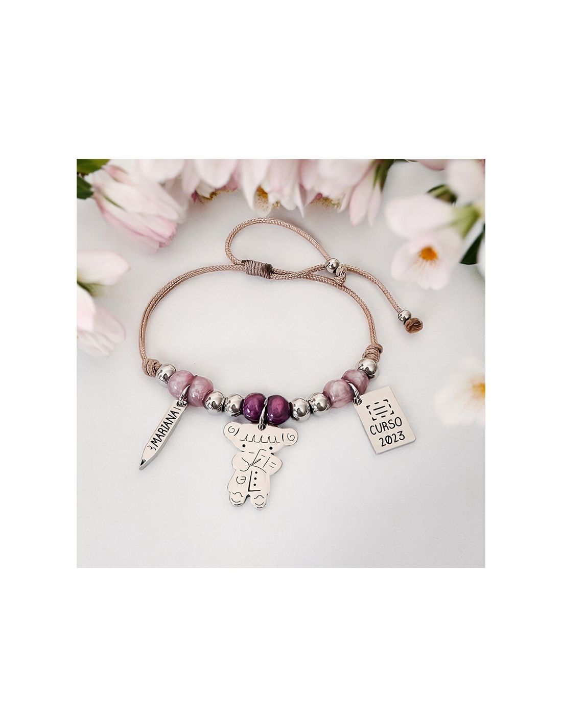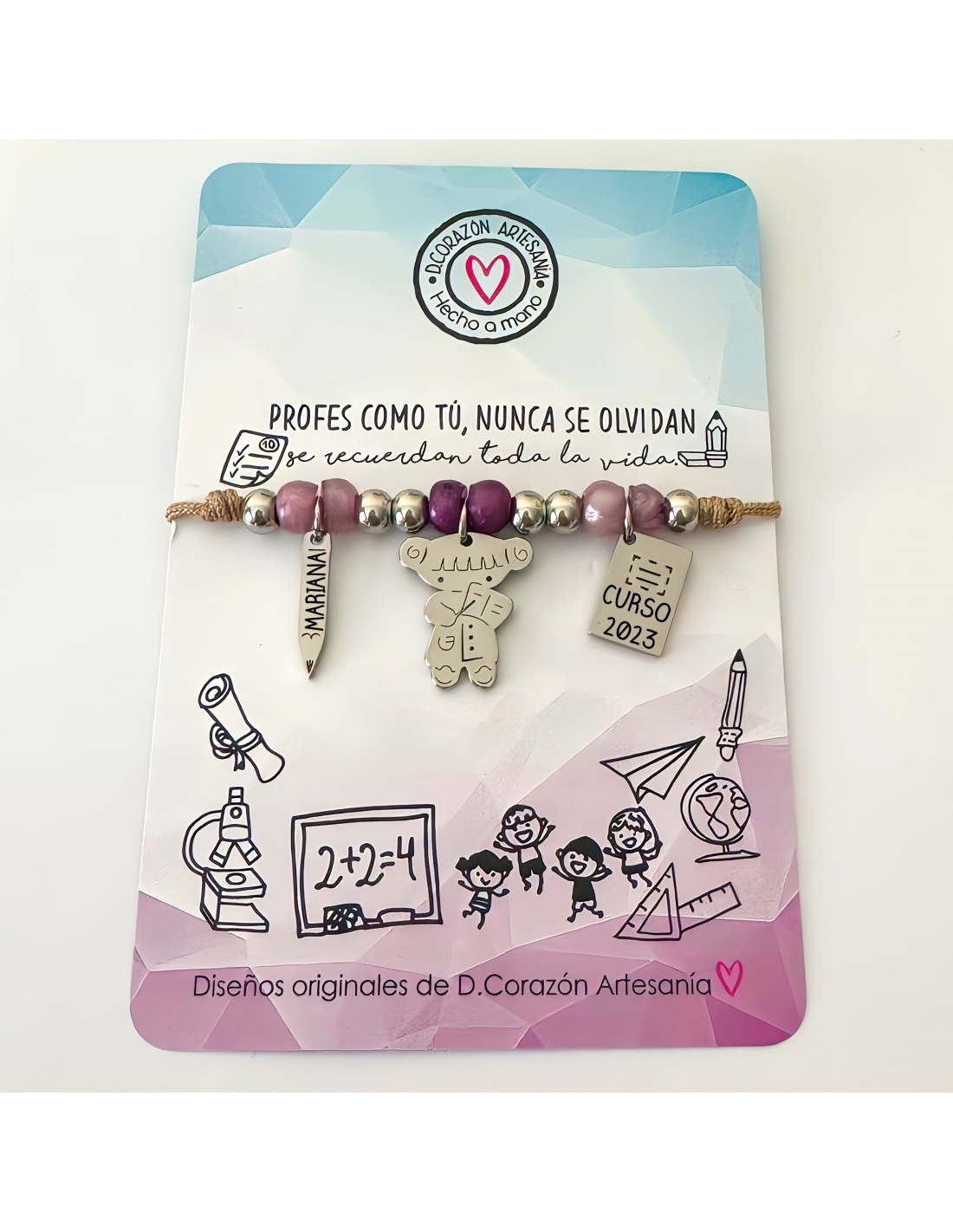Puedes personalizar la pulsera con el nombre del profesor en el lápiz y el curso en la libreta.