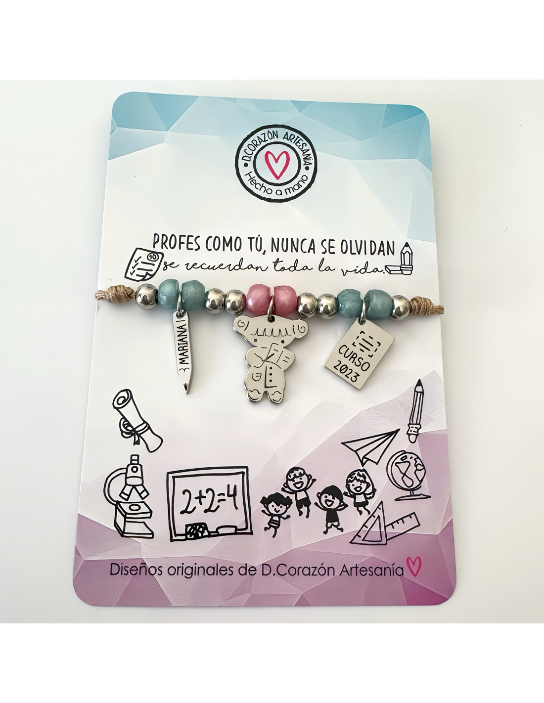 Puedes personalizar la pulsera con el nombre del profesor en el lápiz y el curso en la libreta.