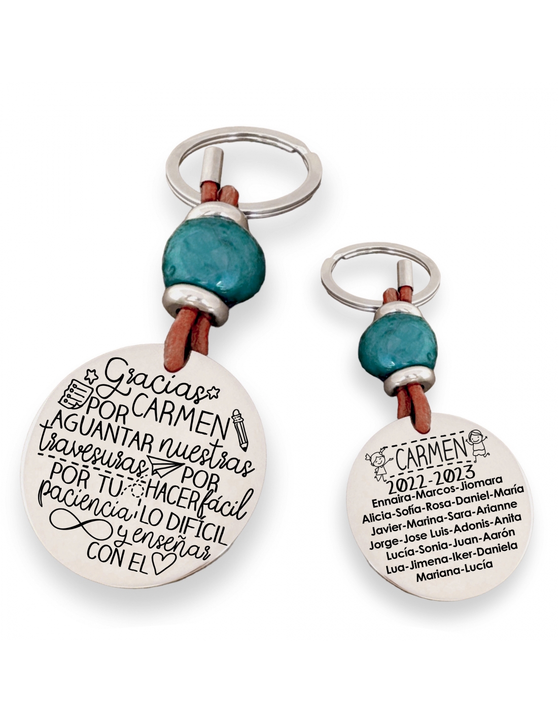 Puedes personalizar el llavero con el nombre de la profesora por delante y por detrás añadir los nombres de los niños de la clase o una dedicatoria, por ejemplo: 1ºB de Infantil 2024.
