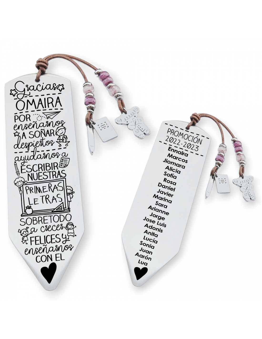 Personaliza el marcapáginas por delante con el nombre del profesor. Puedes añadir todos los nombres de los niños por detrás, junto la promoción, como en el ejemplo.