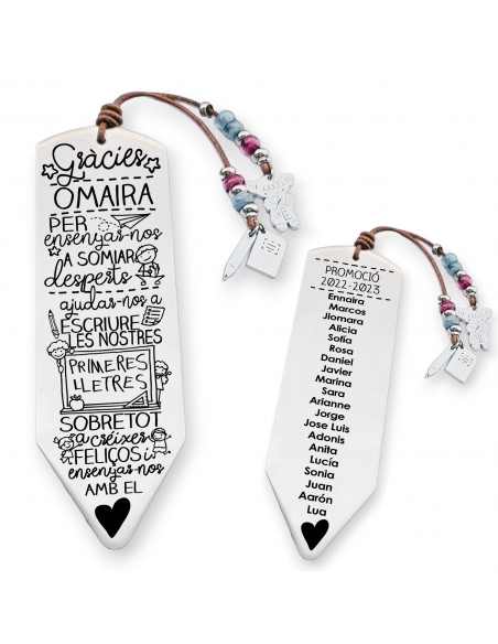 Personaliza el marcapáginas por delante con el nombre del profesor. Puedes añadir todos los nombres de los niños por detrás, junto la promoción, como en el ejemplo.
