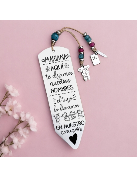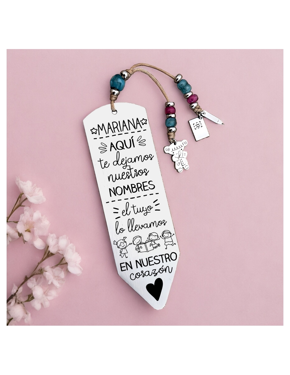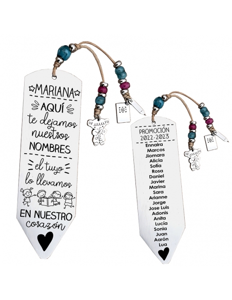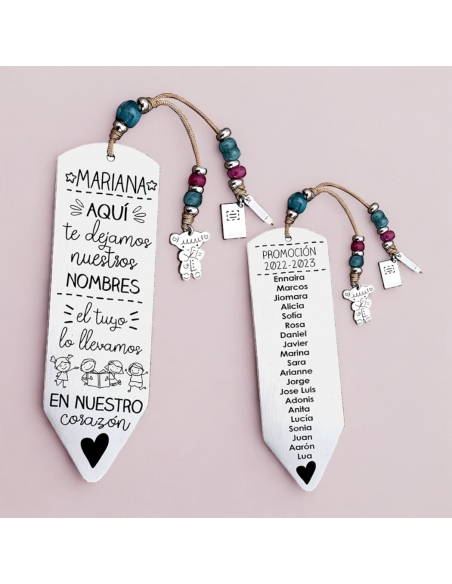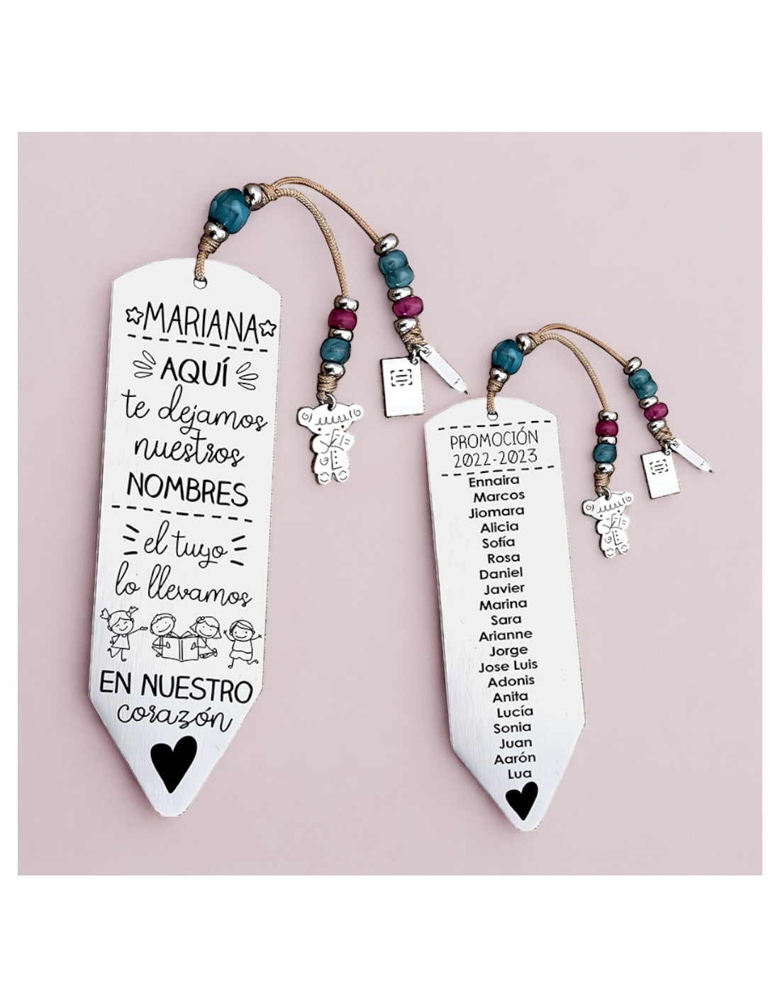 Personaliza el marcapáginas por delante con el nombre del profesor. Puedes añadir todos los nombres de los niños por detrás, junto la promoción, como en el ejemplo.
