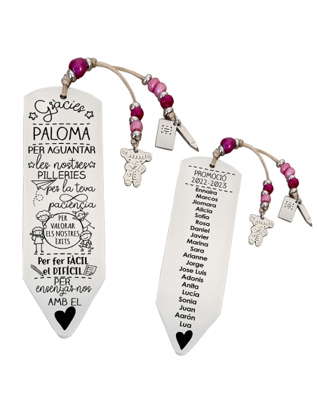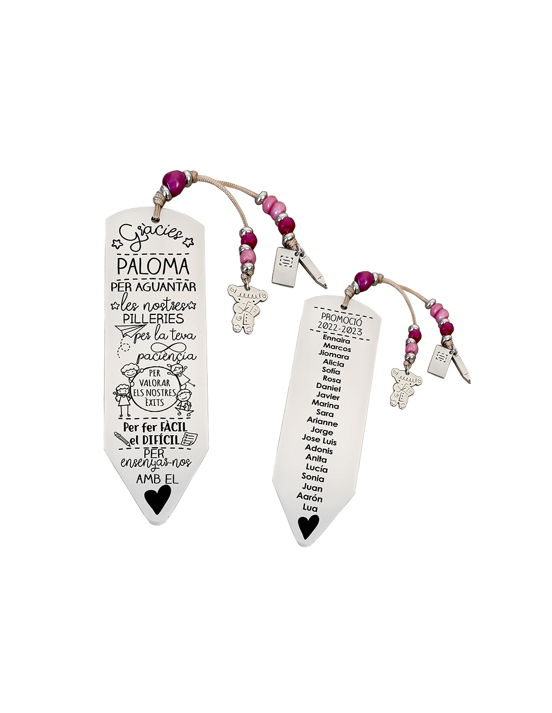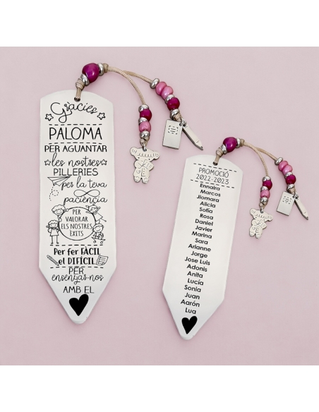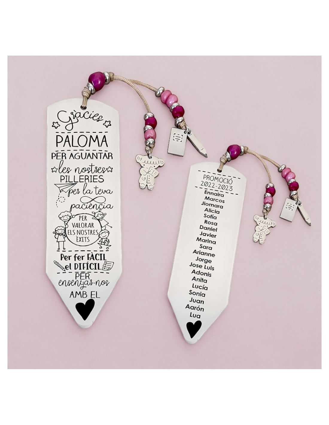 Personaliza el marcapáginas por delante con el nombre del profesor. Puedes añadir todos los nombres de los niños por detrás, junto la promoción, como en el ejemplo.