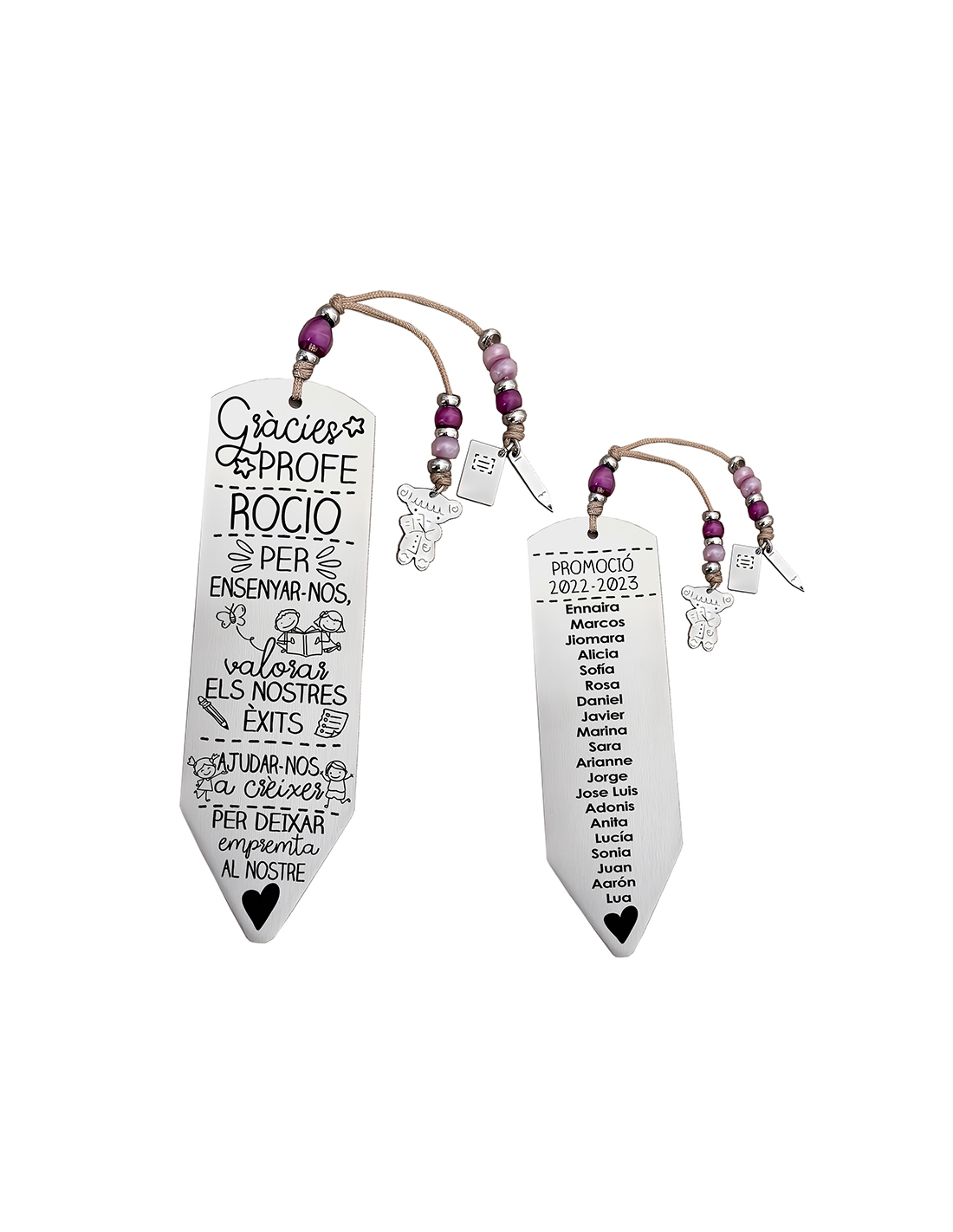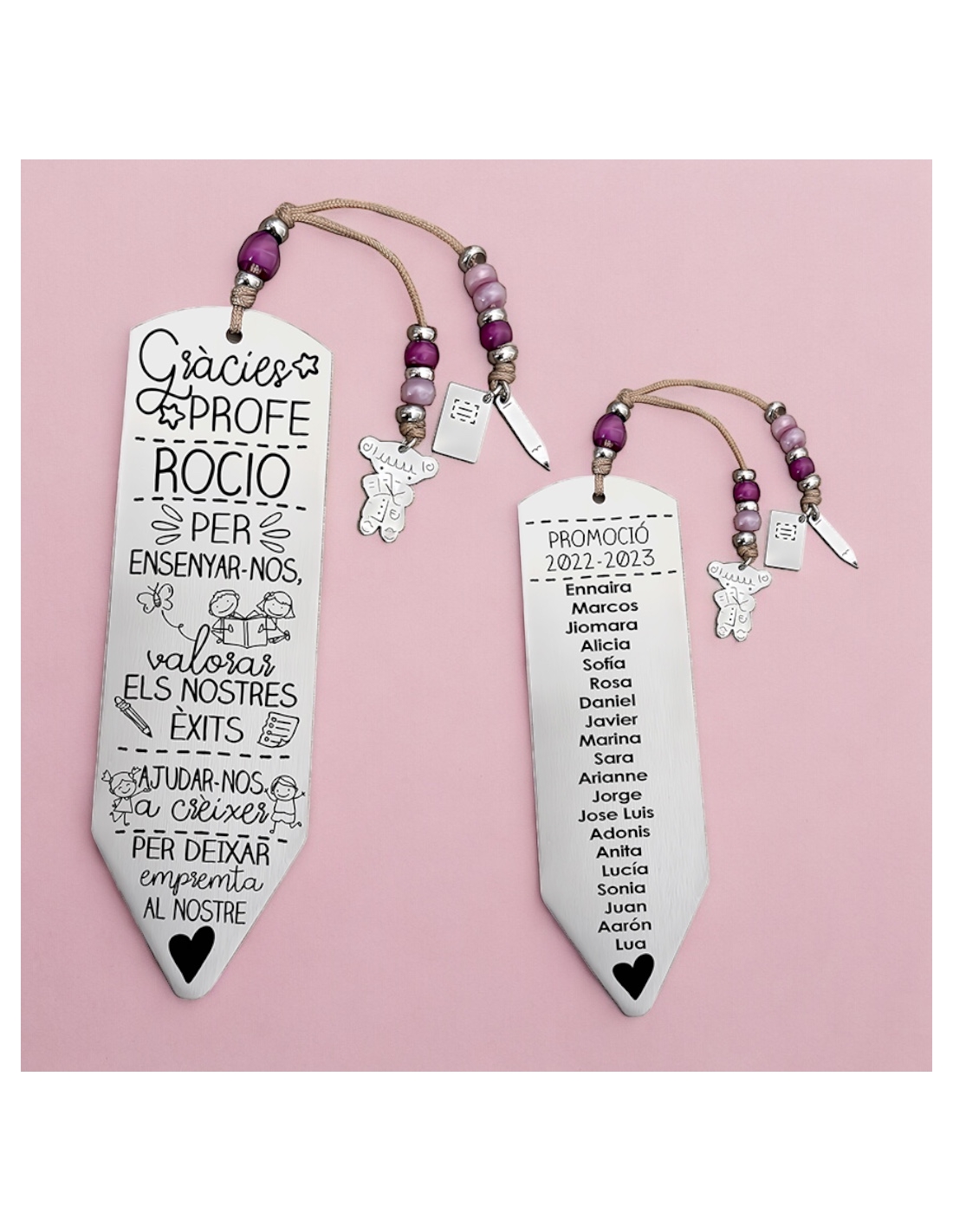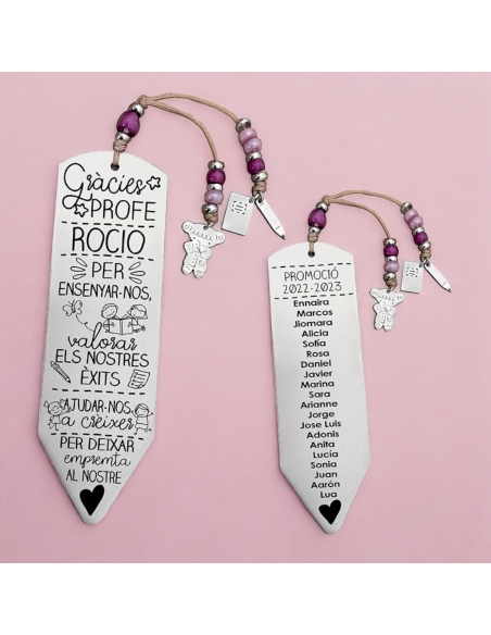 Personaliza el marcapáginas por delante con el nombre del profesor. Puedes añadir todos los nombres de los niños por detrás, junto la promoción, como en el ejemplo.