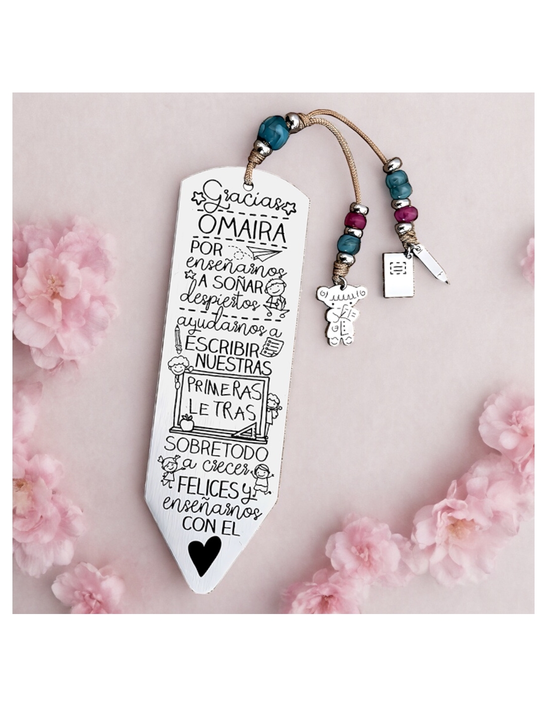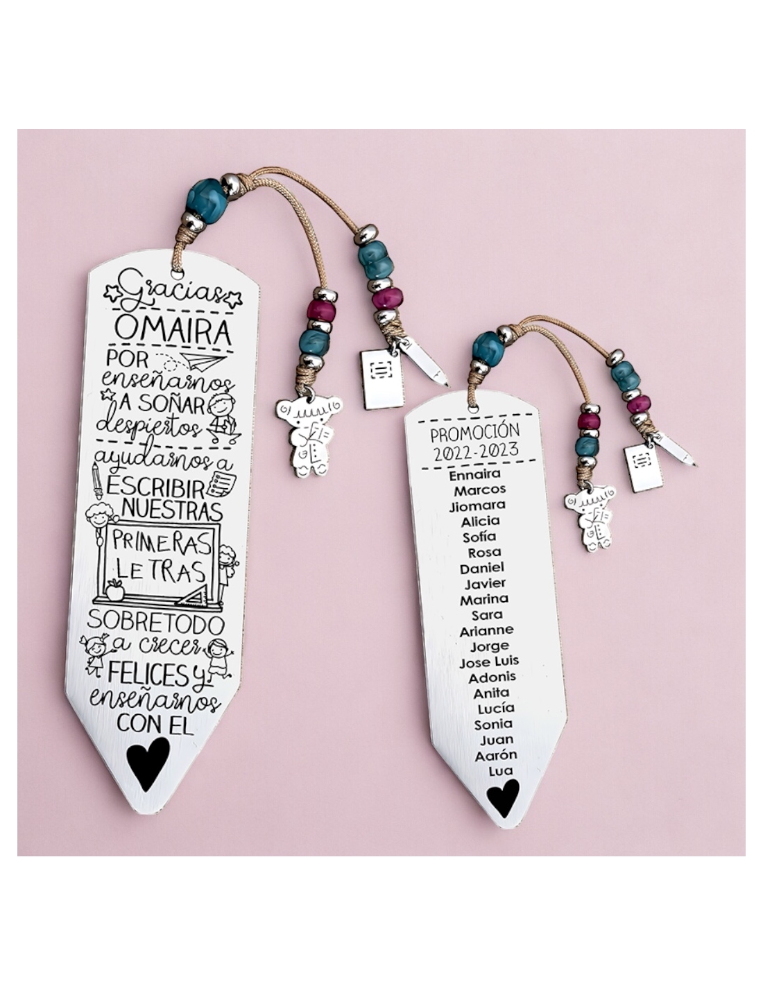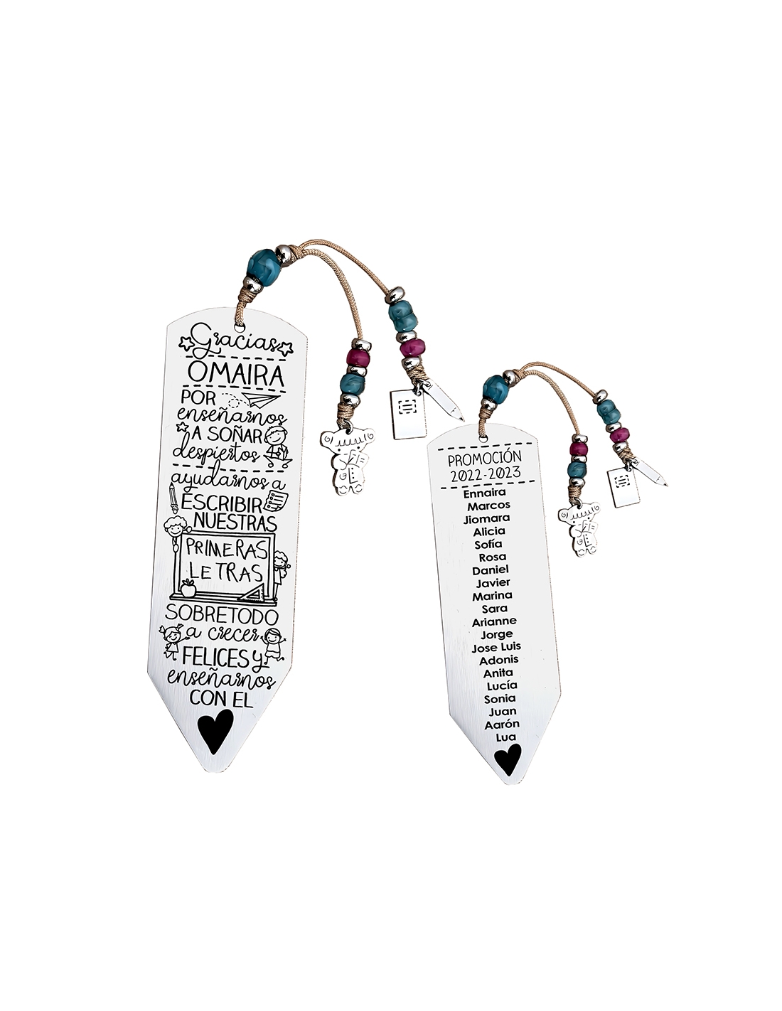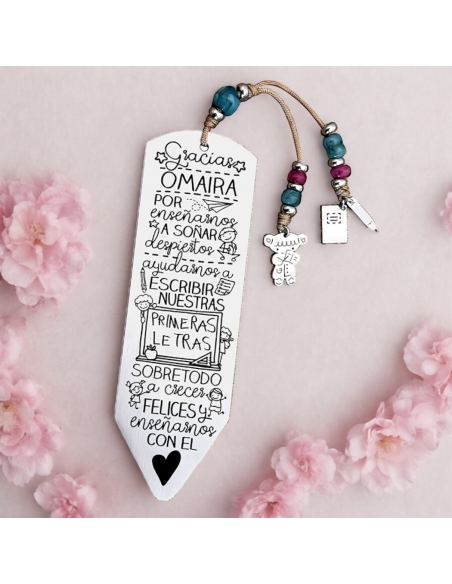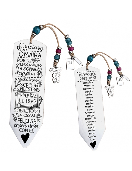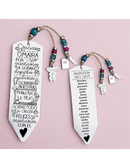 Personaliza el marcapáginas por delante con el nombre del profesor. Puedes añadir todos los nombres de los niños por detrás, junto la promoción, como en el ejemplo.