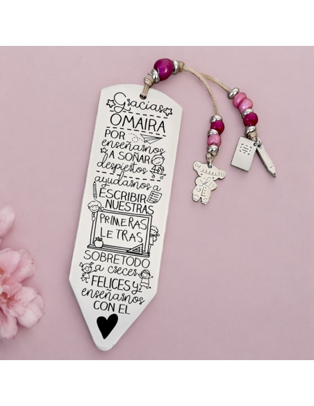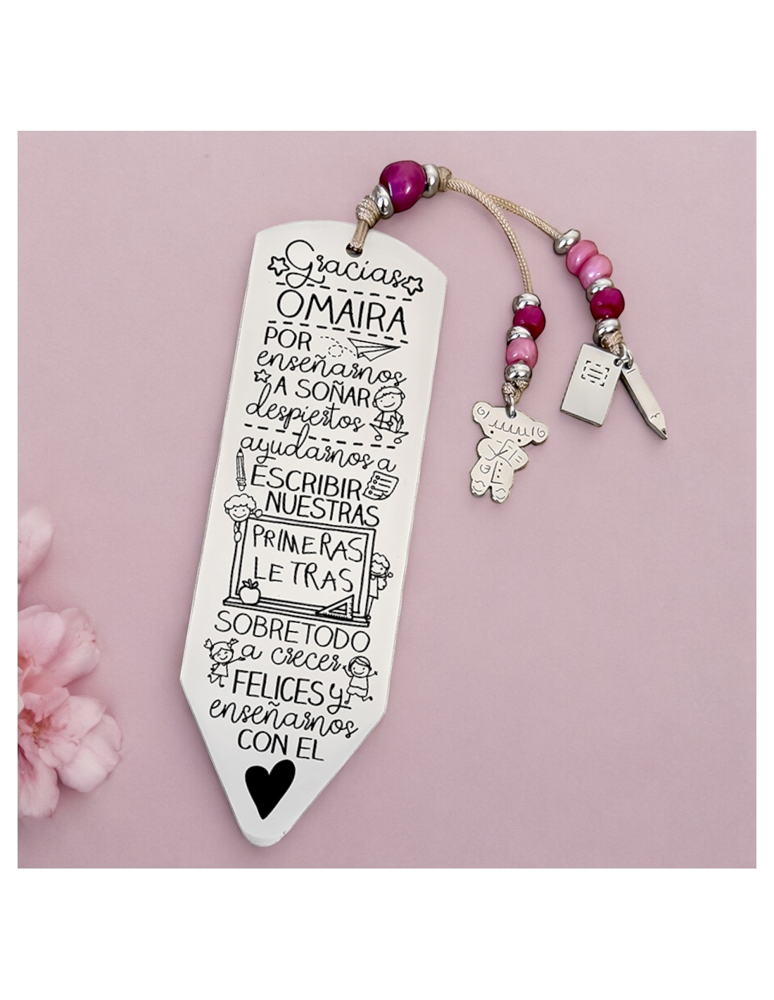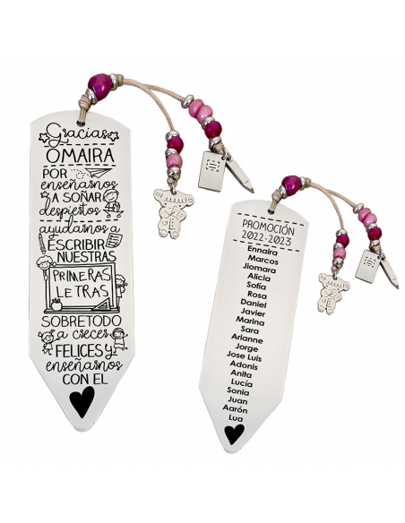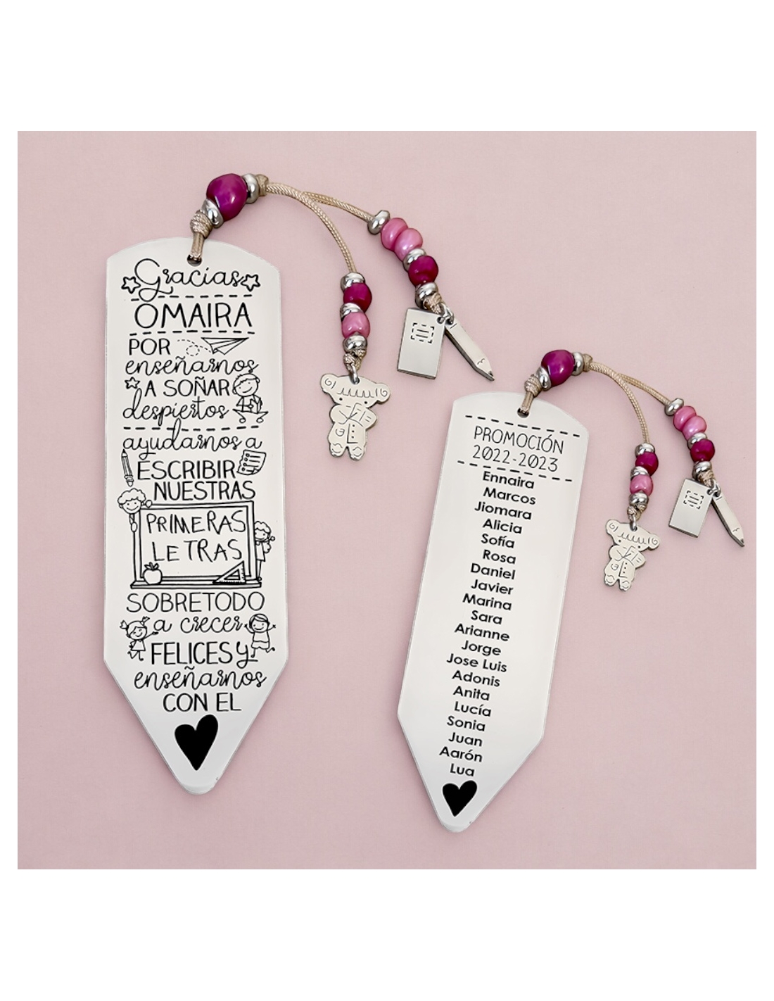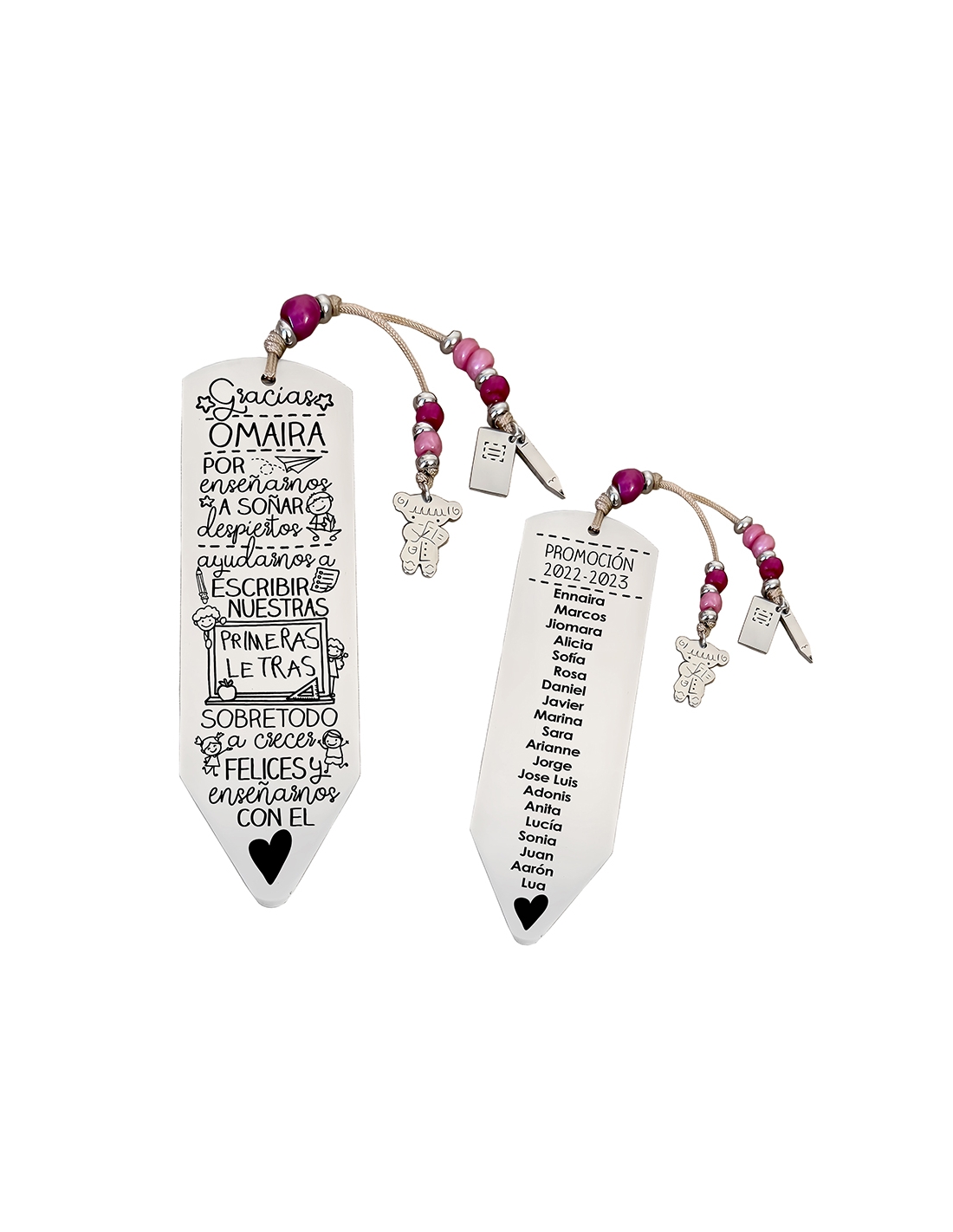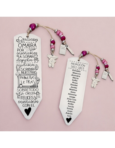 Personaliza el marcapáginas por delante con el nombre del profesor. Puedes añadir todos los nombres de los niños por detrás, junto la promoción, como en el ejemplo.