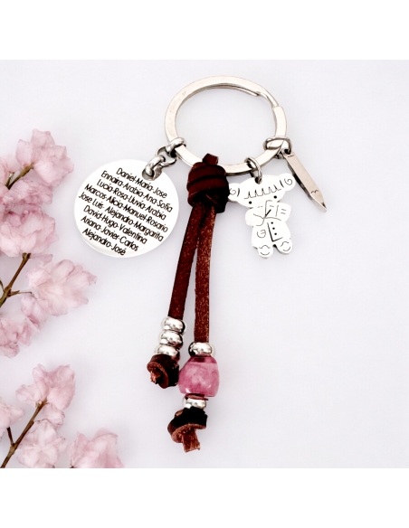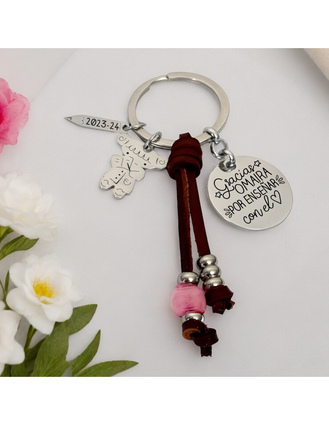 Llavero modelo SIERRA PROFESORA con frase (Gracias (nombre) por enseñar con el corazón) de acero inoxidable y resina.