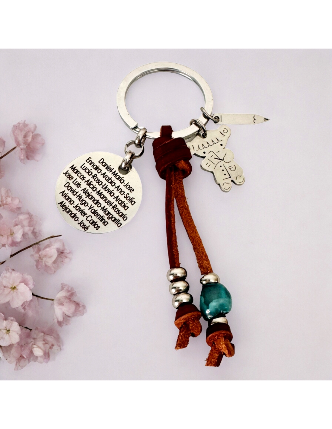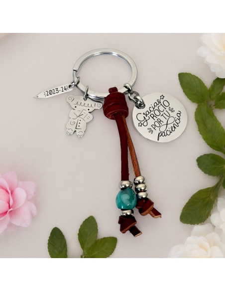 Llavero modelo SIERRA PROFESORA con frase (Gracias (nombre) por tu infinita paciencia) de acero inoxidable y resina.