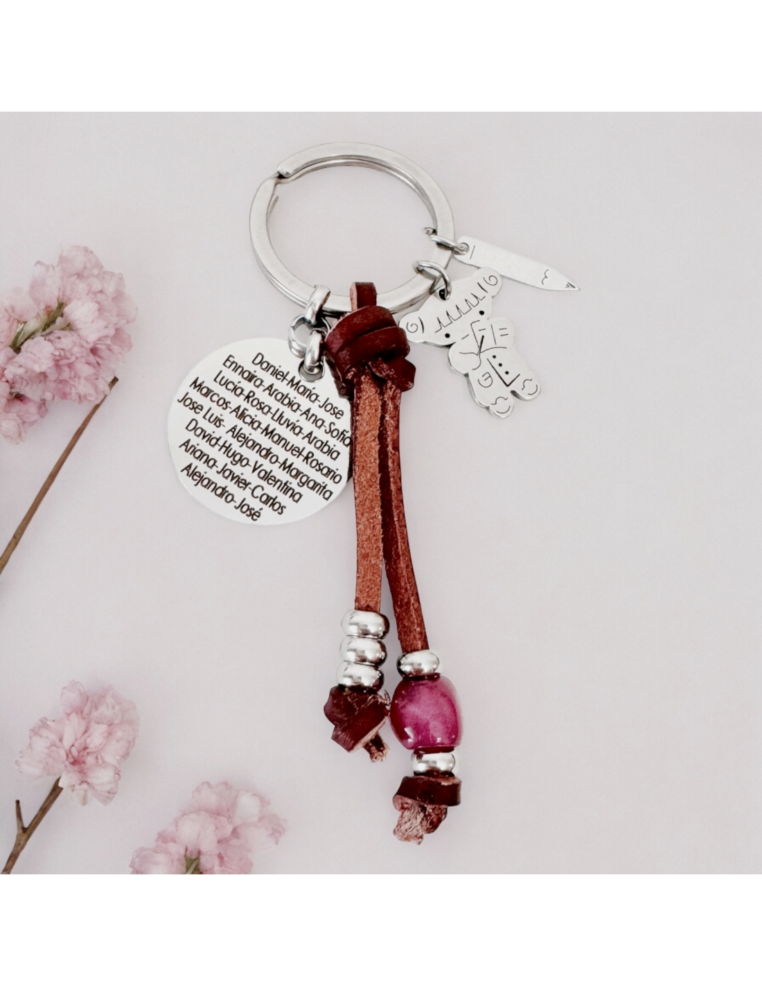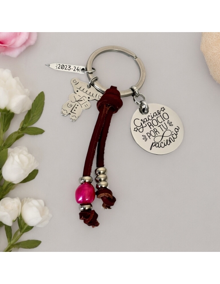 Llavero modelo SIERRA PROFESORA con frase (Gracias (nombre) por tu infinita paciencia) de acero inoxidable y resina.