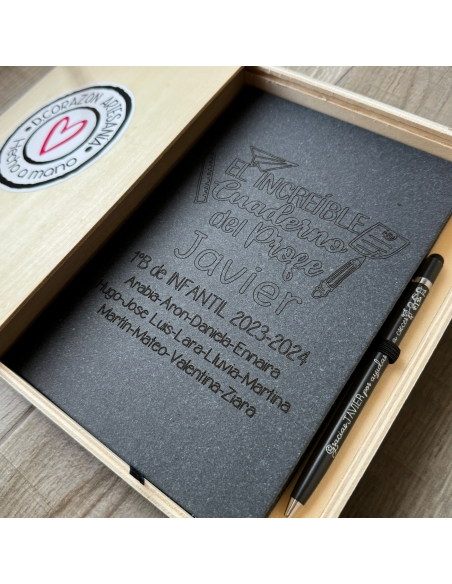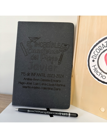Incluye caja de madera, boli a elegir frase con el nombre del profesor y libreta personalizada.